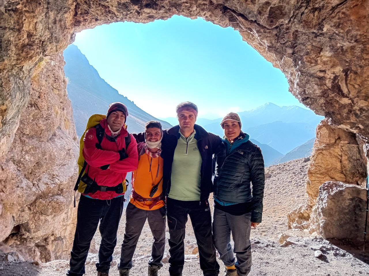 بعد از رسیدن به دروازه دشت جانستون از تیم اصلی به سرپرستی بهمن گل محمدزاده جدا شدیم و بدون هیچ پیش زمینه ایی در مورد صعود به سمت غار اقا بیوک حرکت کردیم . از دور صخره عظیم غار اقا بیوک نمایان شد و به ناگهان مسیر صعودی در ذهنم شکل گرفت و با خود گفتم چرا ما هیچوقت حتی فکر صعود به قله جانستون را از این مسیر نکرده ایم ؟ شاید بدلیل اینکه اصلا تصور صعود از این صخره را نمیکردیم . به داخل غار رفتیم و صبحانه را میل کردیم . فاطمه و حمید تصمیم به ماندن در غار را گرفتند ، عکسی به یادگار در غار و خداحافظی.