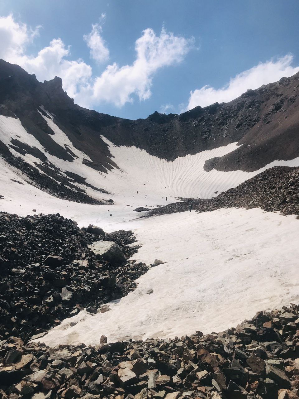 بعد از یک ساعت پیمایش به انتهای دره رسیدیم که با پاکوبی کاملا مشخص به هسار چال منتهی میگردد اما تیم ما در جهت دره موازی سمت راست هسارچال ادامه مسیر داد و بعد از حدودا دو ساعت پیمایش و صعودی دست به سنگ از یالی صخره ای به یال اصلی قله مرجیکش رسیدیم. بر روی یال پاکوبی مشخص تا قله مرجیکش ادامه دارد . قله مرجیکش با ارتفاع ۴۵۷۰ متر از قلل بلند منطقه علم کوه میباشد اما بخاطر نداشتن تابلو قله متاسفانه مورد لطف کوهنوردان قرار نمیگیرد . ساعت ۱۱ بر فراز قله مرجیکش ایستادیم و بعد از انصراف ۳ نفر از همنوردان از ادامه صعود، تیم در ساعت ۱۱:۳۰ به سمت علم کوه حرکت و در ساعت ۱۳ موفق به صعود شدیم . حدودا یک ساعتی را بر روی قله استراحت و چند عکس قله به یادگار گرفتیم و فرود را اغاز کردیم .کمی پایین تر از قله علم کوه تصمیم گرفتیم به داخل دره سمت چپ (حدودا شرقی) فرود را ادامه دهیم که با احتیاط و رعایت تکنیک های فرود به داخل کاسه برف چالی وارد و ادامه مسیر دادیم و بعد از ۳ ساعت و نیم در ساعت ۵:۱۵ به تنگه گلو (ابتدای مسیر) رسیدیم. متاسفانه علیرغم قراری که با راننده محترم نیسان گذاشته بودیم باز هم چند ساعتی منتظر این عزیزان زحمتکش شدیم . متاسفانه این بی نظمی سالهاست که در این منطقه ادامه دارد و یکی از دلایل ان عدم وجود انتن موبایل در این منطقه میباشد.