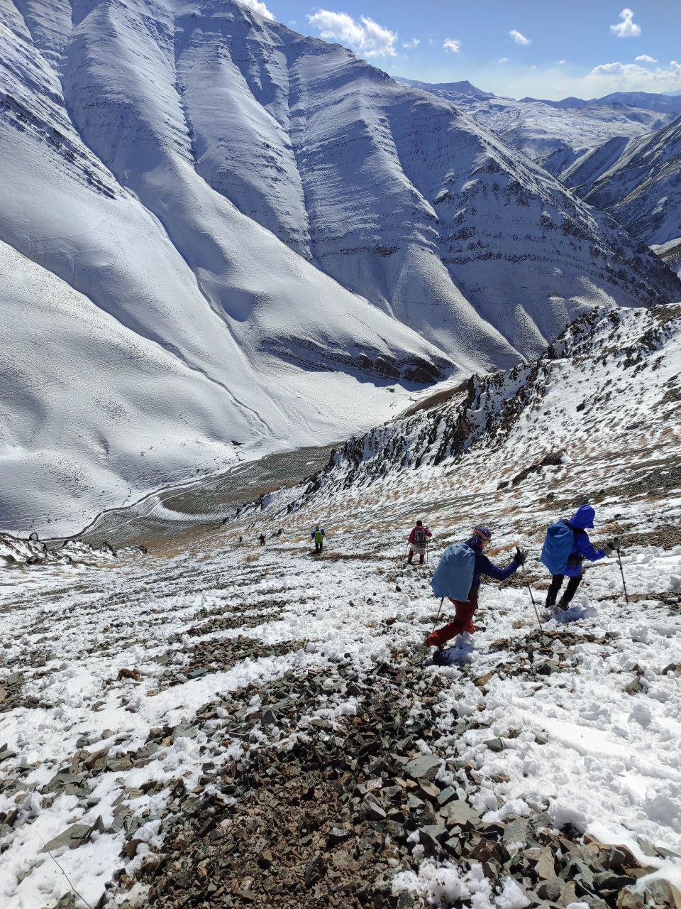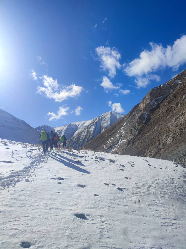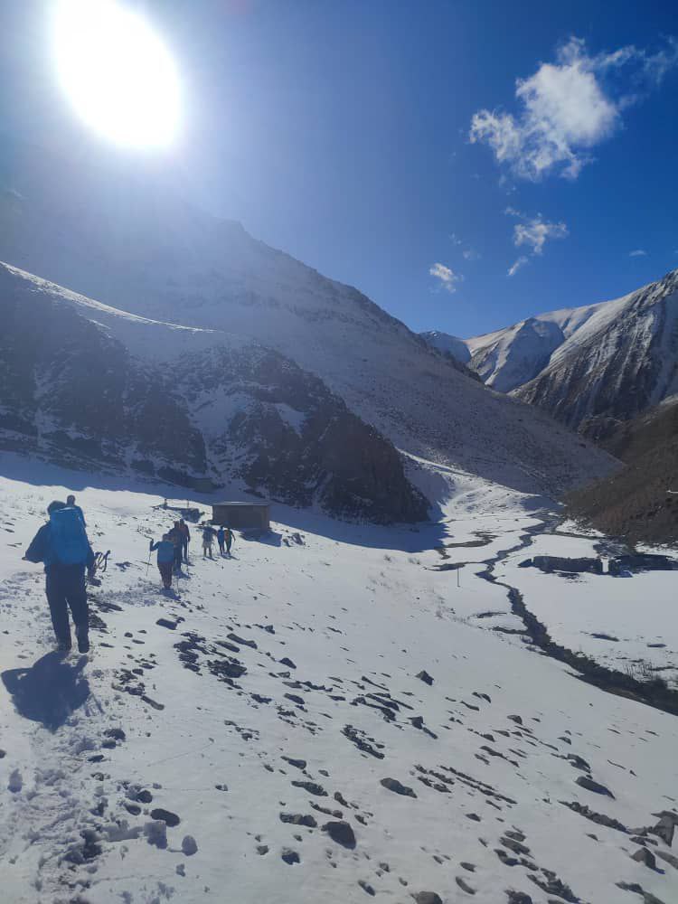 بعد از ۴۵ دقیقه پیمایش به قله فرعی به ارتفاع ۳۷۲۰ رسیدیم و در ادامه تا گردنه شیور چال ادامه دادیم و از دهلیزی به سمت جنوب و رودخانه دیزین فرود آمدیم . و بقیه مسیر را در پاکوب کنار رودخانه به سمت دیزین حرکت کردیم.