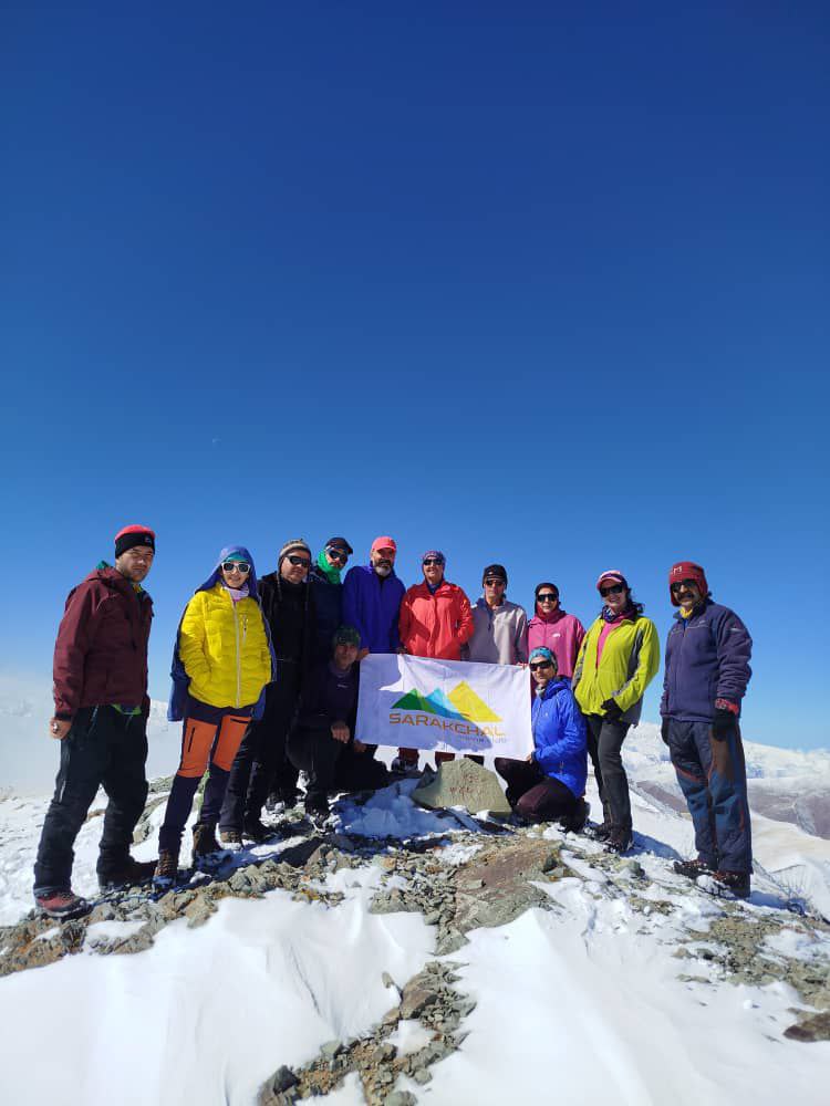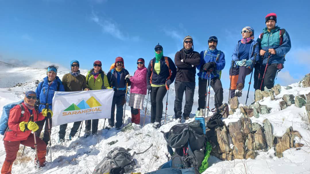 از روی یال با شیب تند و شن اسکی به سمت شمال حرکت کردیم و اولین نفرات گروه ساعت ۱۱:۴۰ و در ساعت ۱۲ همه ۱۳ نفر به قله رسیدند ( ارتفاع قله سه چال ۳۹۴۰ متر ).