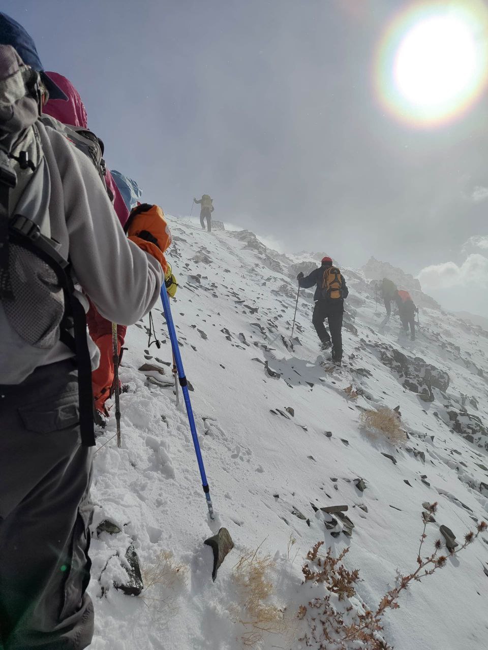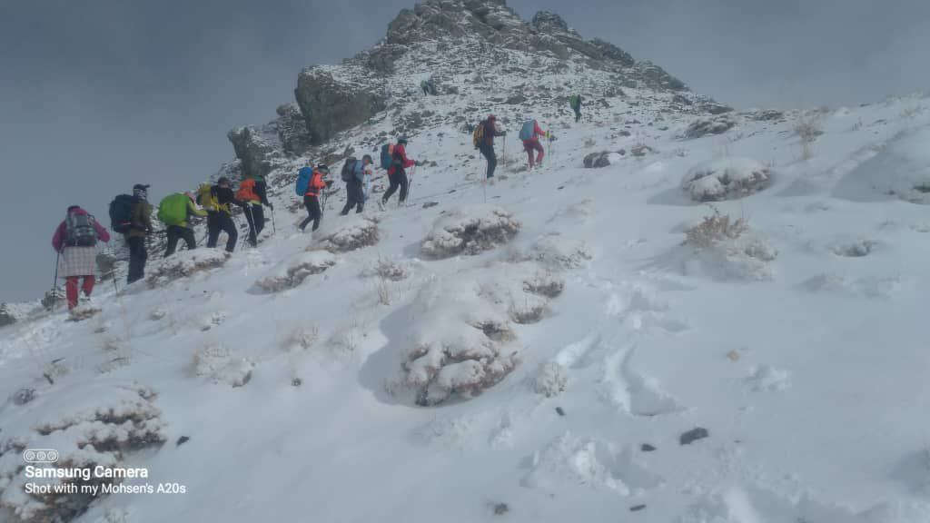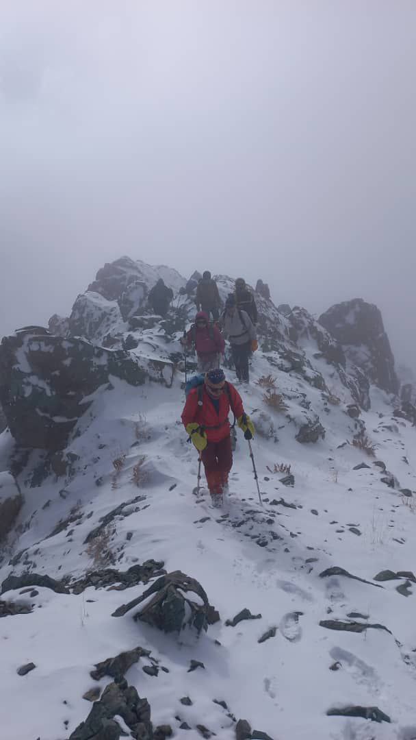 بعد از کمی استراحت ۹ نفر از روی خط الراس به سمت شرق حرکت کردیم و ۴ نفر نیز در قله ماندند تا گروه آقای خليل آبادی برسد .