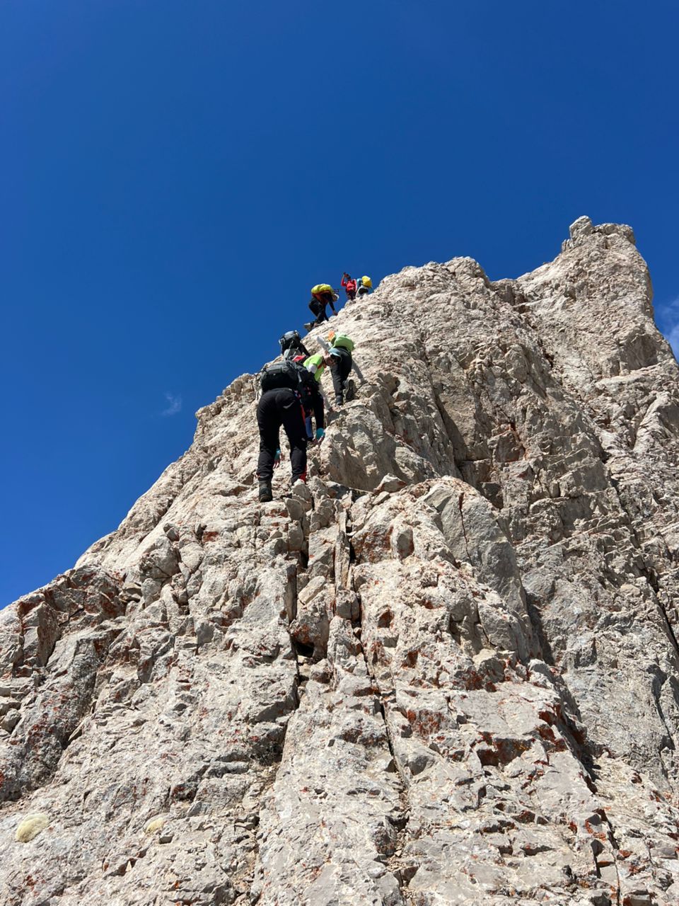 ساعت 9:30 کار جدی ما تازه شروع شد . باتوم ها رو جمع کردیم ، دستکش بیس ها رو در آوردیم و داخل کوله گذاشتیم . طناب انفرادی و کارابین پیچ ها رو دم دست گذاشتیم که در صورت نیاز دسترسی فوری به آن داشته باشیم . در این فصل بد نیست یه کلنگ همرا تیم باشه که ما همراه داشتیم . سنگنوردی شروع شد !! توی گزارش ها خونده بودم دو جای مسیر کراکس داره ، البته باقی مسیر هم عبور از تیغه هاست . عذرخواهی بابت استفاده از کلمه ” کراکس ” چون معادل فارسی نداره یا بهتره استفاده نشه .