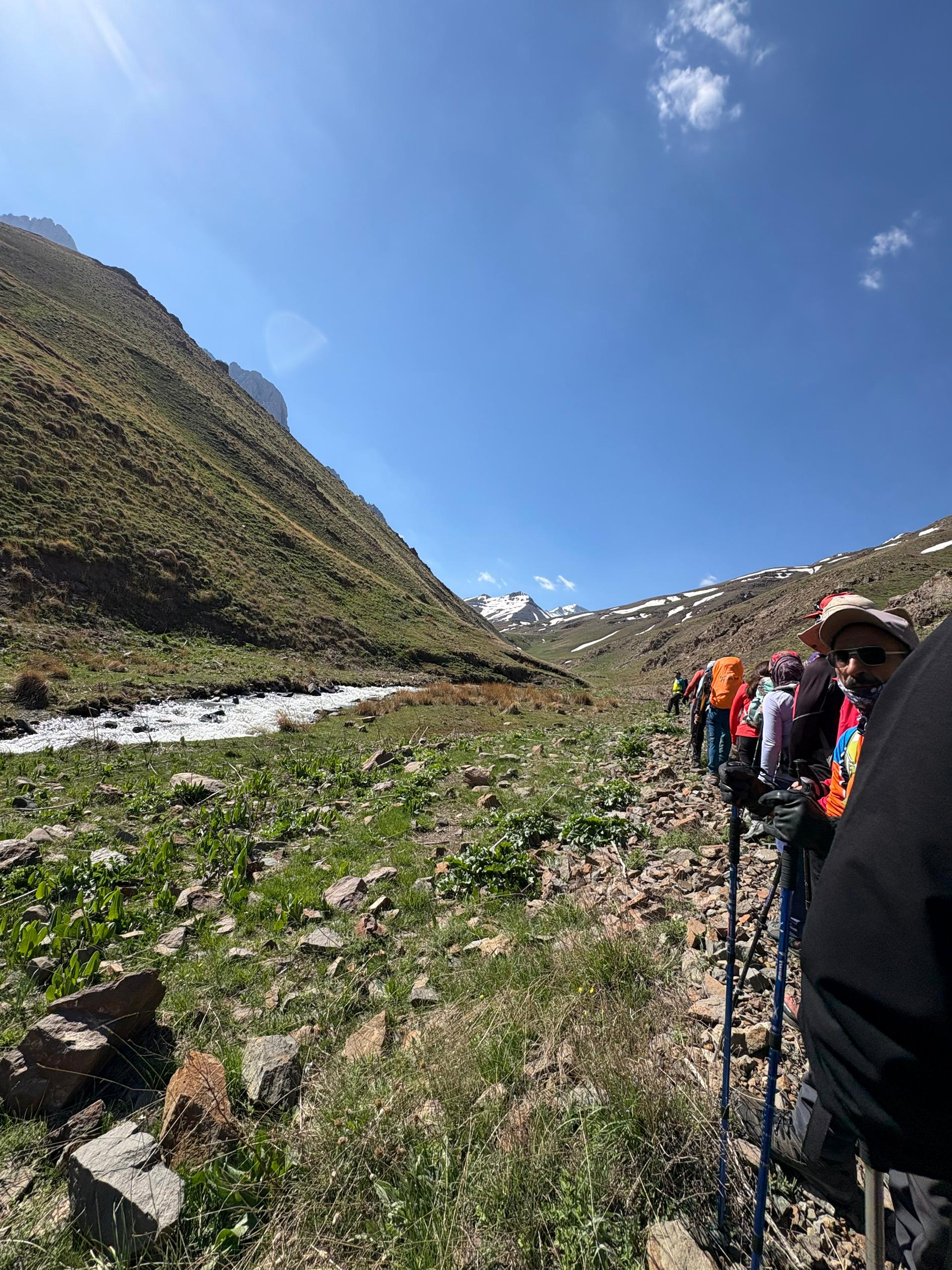 عکس ها با قله گرفته شد و با پرچم باشگاه عکسی به یادگار . ساعت 12:30 تیم به سمت ” گردنه چورن ” سرازیر شد . از دور تمام تیم ما چشم به راه برای دو تیم دیگر از باشگاه سرکچال بود . اولین دیدار با دونفر از تیم روستای وارنگه . کلی خوش و بش کردیم و آرزوی موفقیت برای اونها کردیم . در مسیر برگشت با هماهنگی آقای خلیل آبادی چند نفر از تیم نرمال که در گردنه چورن نشسته بودند را به همراه خود به روستا برگردوندیم . روی گردنه چورن که ارتفاع تقریبی 3800 متر رو نشان می داد ناهار میل کردیم و بعد از صرف ناهار به سمت روستای کلاک حرکت کردیم . تقریبا نیمی بیشتر از مسیر برگشت روی برف چاله ها و یخچال ها بود که بچه ها یه برف بازی حسابی کردند و روی آن سر می خوردند . قسمت هایی از مسیر هم نیاز به برفکوبی داشت که انجام شد . از گردنه تا خود روستا چالش دیگری نیست و مسیر نرمال کوه پیمایی است .