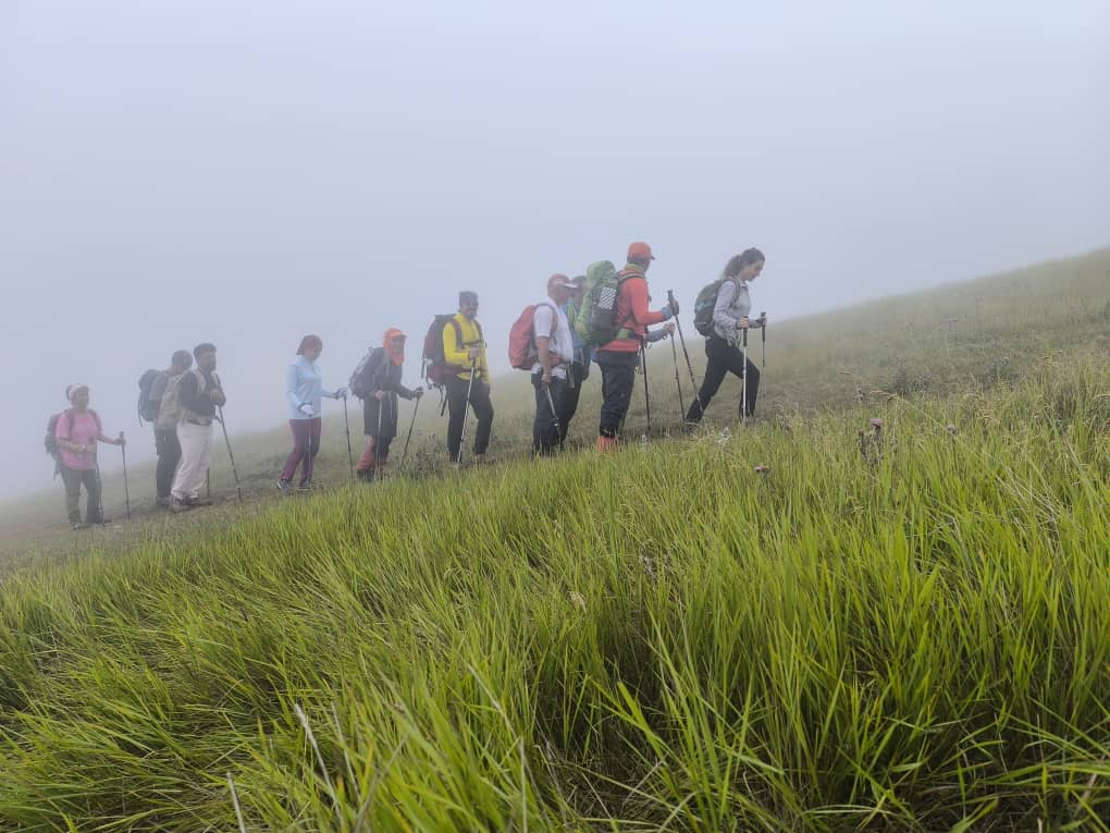 در ادامه یال را بالا رفته و زمانی که به مرتع رسیدیم از طریق پاکوب در هوای مه آلود به راه خود ادامه داده و در یکصد متری قله ، ابرها در زیر پای ما قرار گرفتند و پناهگاه قله نمایان شد .