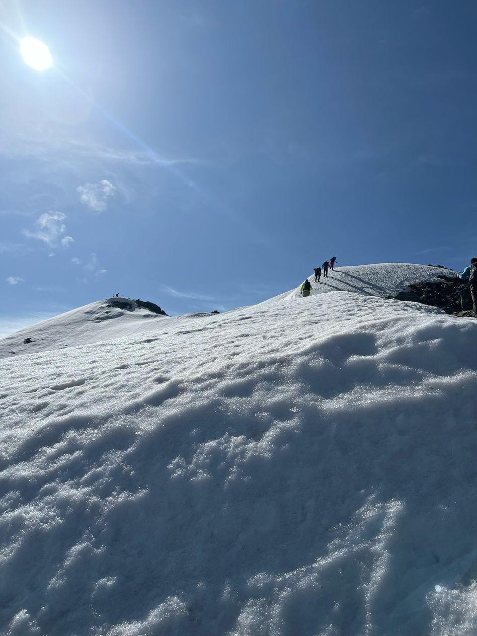 دربعضى قسمتها نياز به دست به سنگ شدن بود كه ساعت 9به قله همهن رسيديم و 20دقيقه زمان برای صرف صبحانه و استراحت در نظر گرفتیم ، از فراز قله همهن ادامه خط الرأس به خوبی مشخص میباشد و امروز قله مهرچال پوشیده از برف بعنوان بلندترین قله در اين خط الرأس خودنمایی می‌کرد.