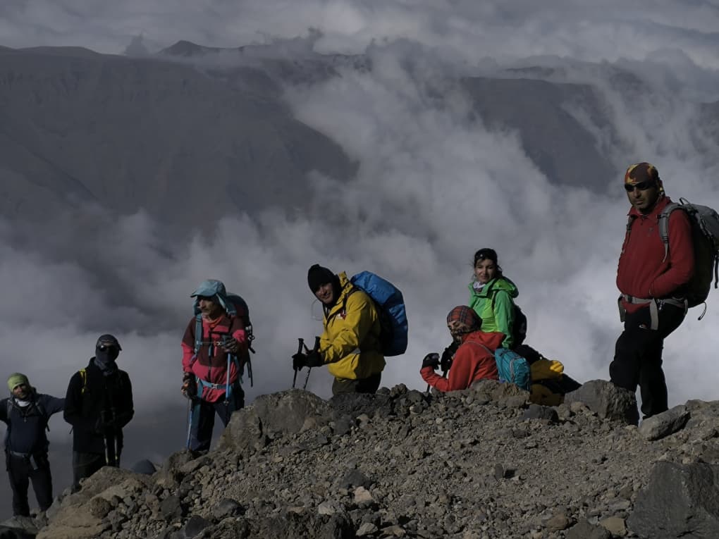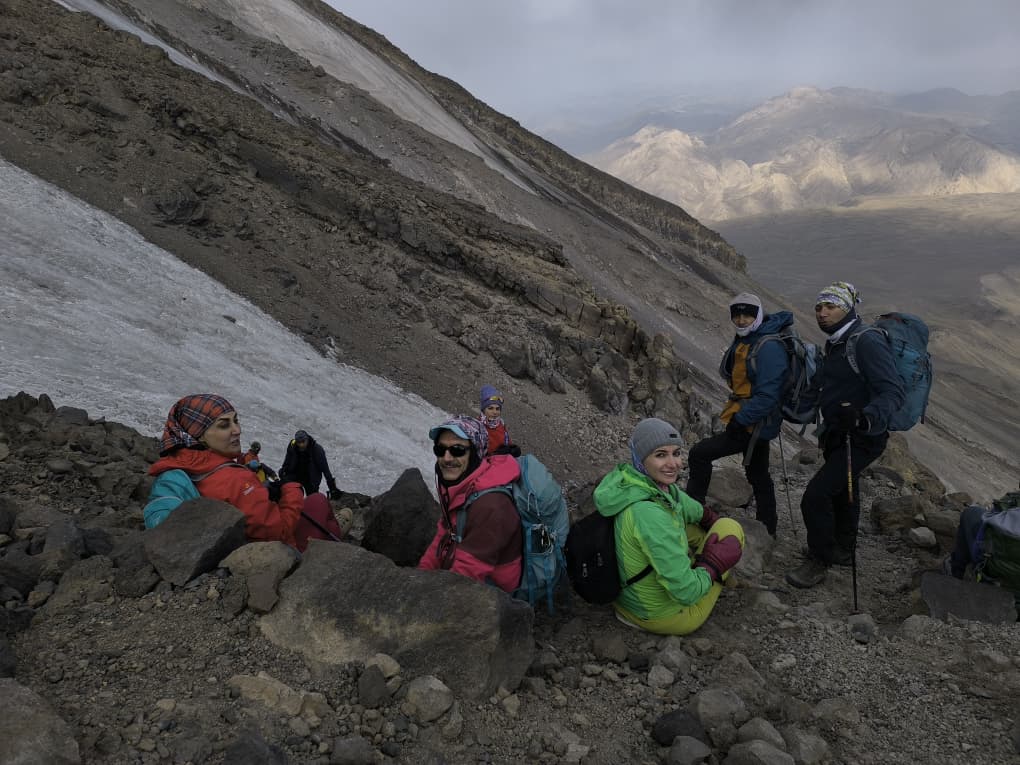 کوله های سنگین و مسیر دست به سنگ زیر جانپناه تیم ما را کمی به چالش کشید و اولین نفرات ساعت 7:15 و آخرین ها ساعت 8:30 به جانپناه رسیدیم، با تیم دوم در ارتباط بودیم ، دو نفر از اعضا بدلیل عدم هم هوایی و ارتفاع زدگی در ارتفاع 4400 چادر بر پا کردند و از صعود به قله منصرف شدند.
