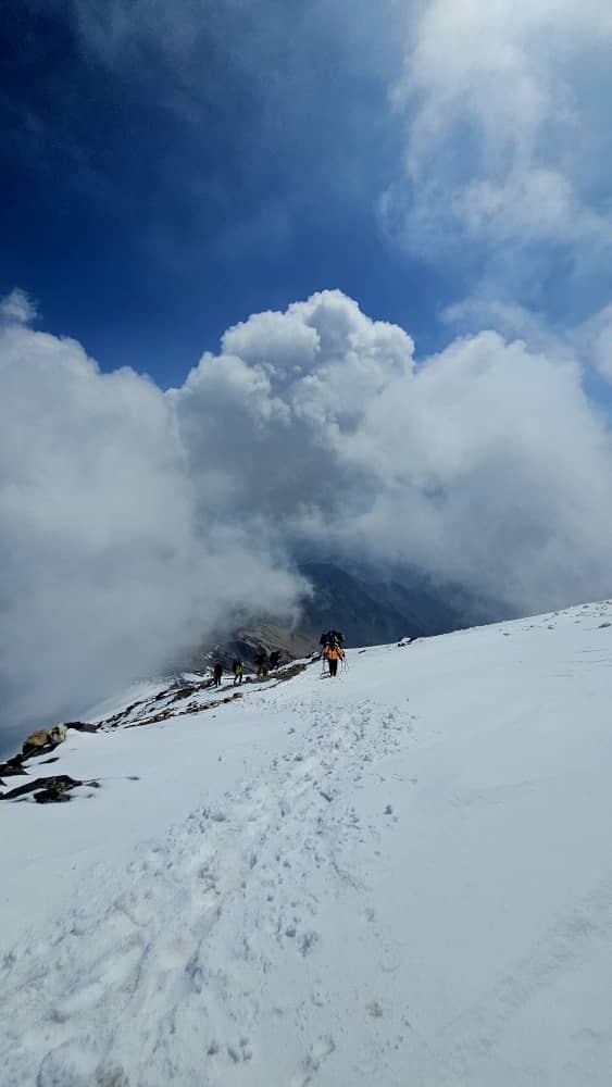 طلوع خورشید و تابش نور طلایی آن بر یخچالها، فضای مسیر را از نظر بصری بسیار چشمنواز کرده بود. در ارتفاعات بالاتر، به دلیل شدت تابش و بازتاب نور از برف، بسیاری از اعضا لباسهای سبکتری پوشیدند و صعود با روحیهای بالا ادامه یافت تا نهایتاً: