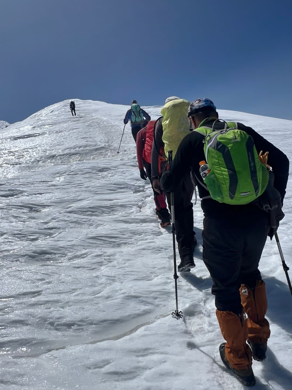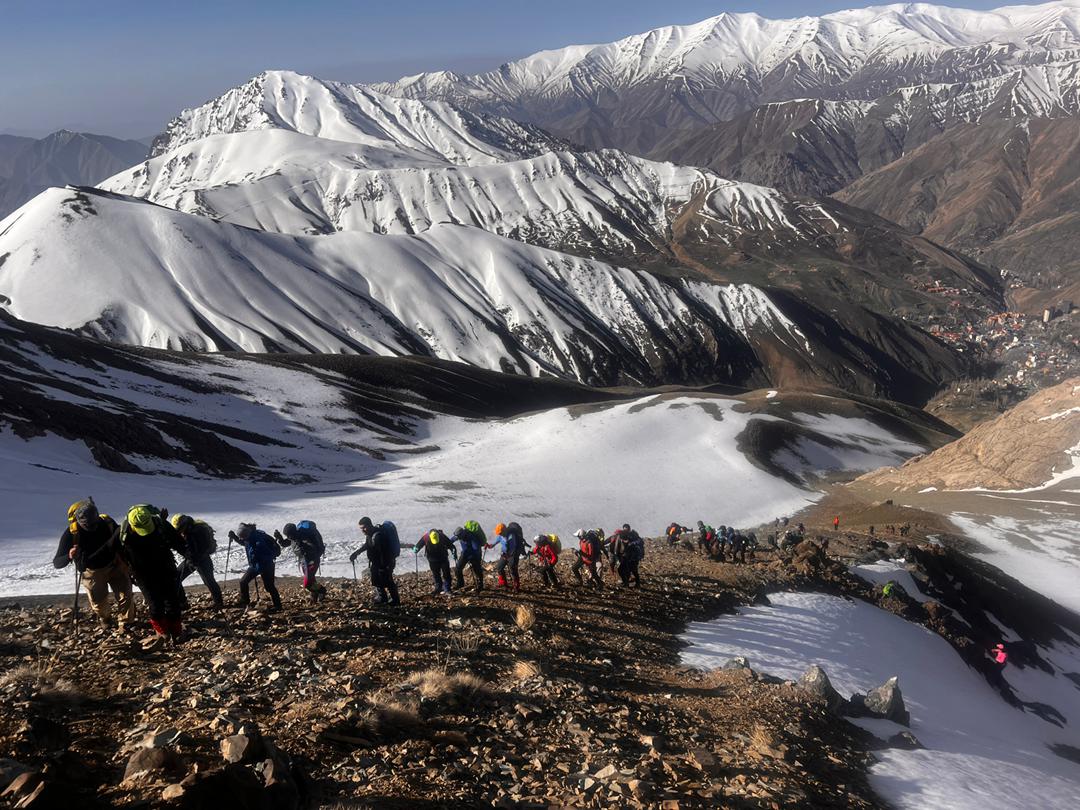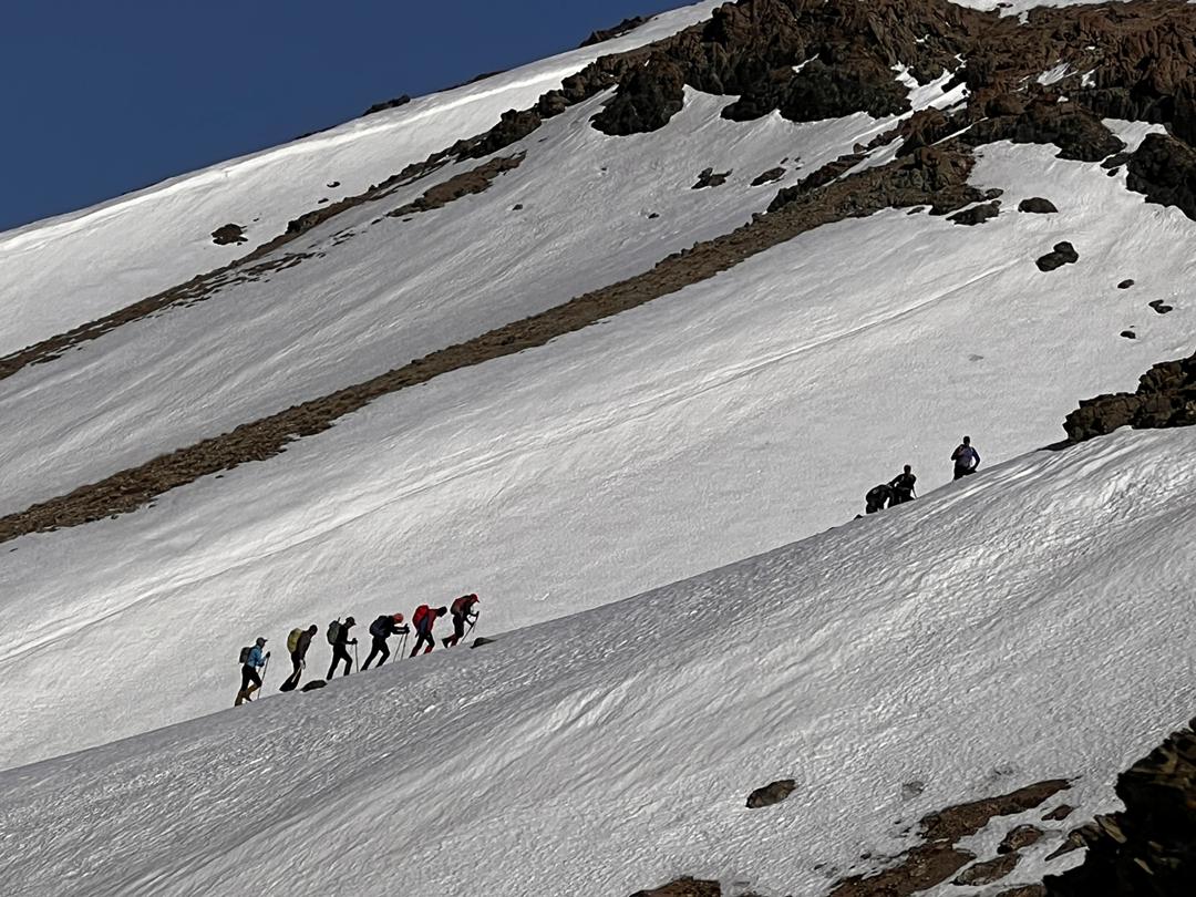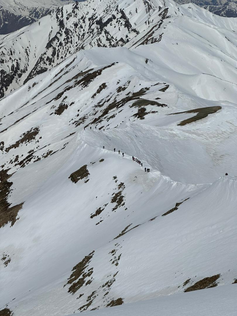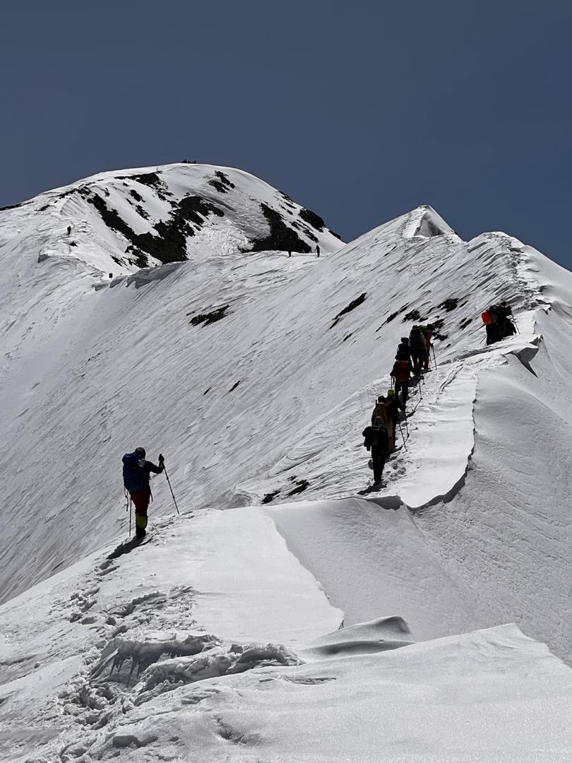 این یال از زیر دیواره شروع میشه و تا خط الراس کلون بستک به سرکچال ادامه پیدا میکنه.تصمیم گرفتیم تیم به دو قسمت تقسیم بشه و تیم سرعتی از یال کناری مسیر زمستونی که دست به سنگ هم بود صعود کنند و بقیه نفرات از یال زمستانی .خط الراس کلون بستک به سرکچال خطالراسی بسیار مهیج و جذاب در فصل زمستان هستش و شما ساعت ها در ارتفاع بالای ۴۰۰۰ متر هستین و این نکته مشخصه بارز این منطقه هستش. پس از رسیدن به خط الراس در ساعت ۹ صبح و عبور از نقاب های برفی در نتیجه یه تلاش جانانه و عبور از نقاب های برفی حدودا ساعت ۱۰ صبح اولین قله سرکچال از مجموعه قلل سرکچال صعود شد.قبل از قله هنگام عبور از نقاب های برفی به محل شکستن یکی از این نقاب ها در اون روز تلخ رسیدیم، نقاب هایی که شکستند و حسین رو با خودشون بلعیدند 😔