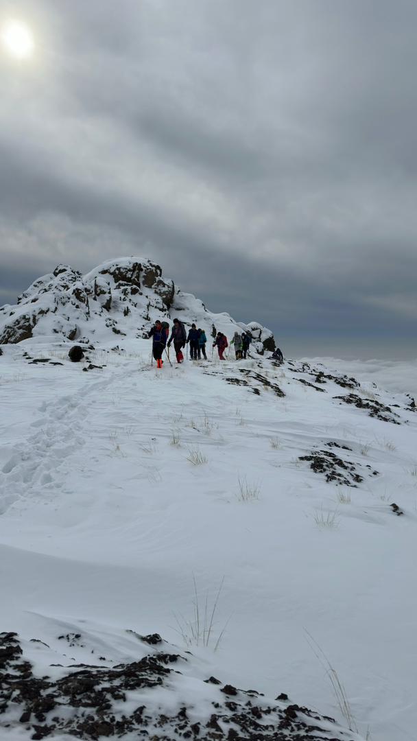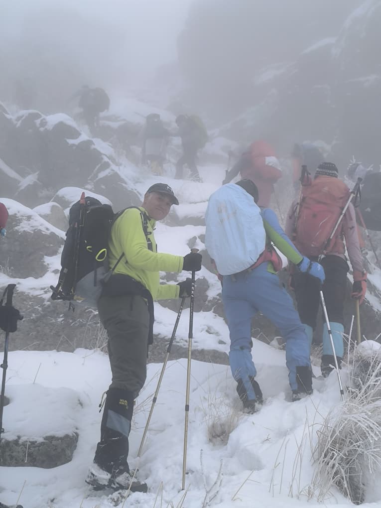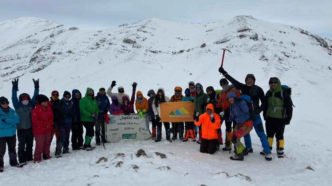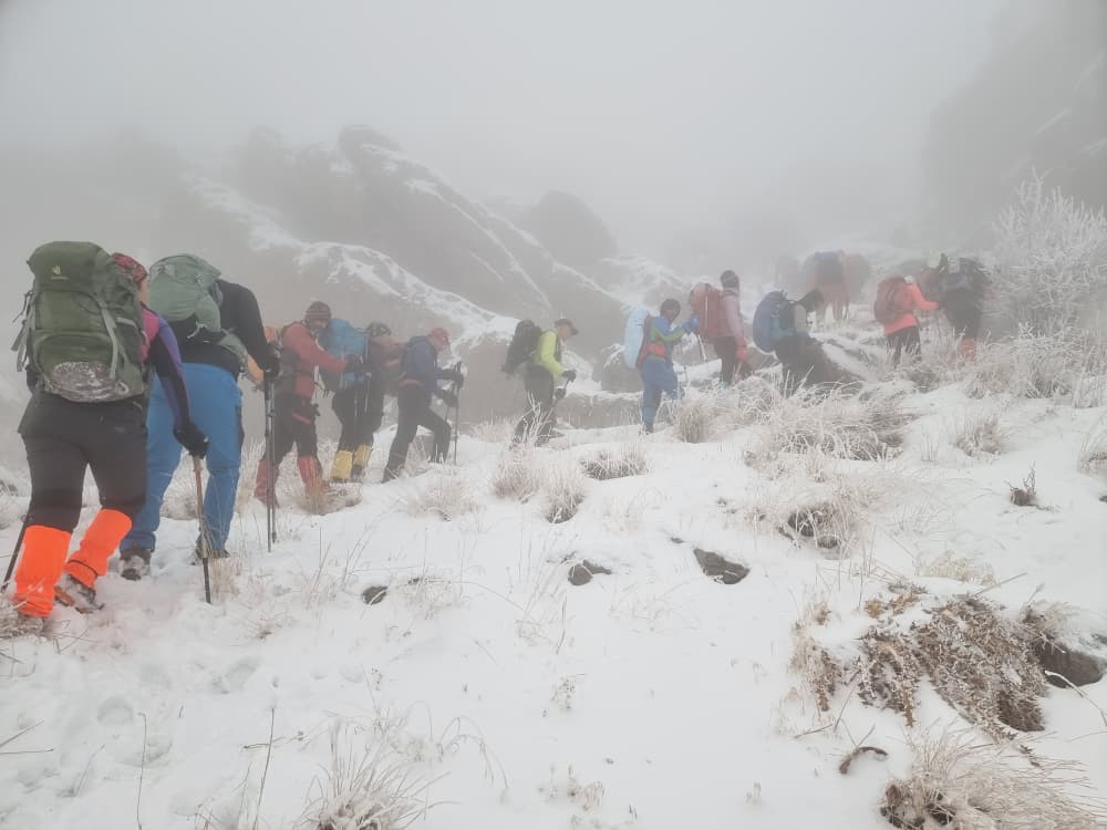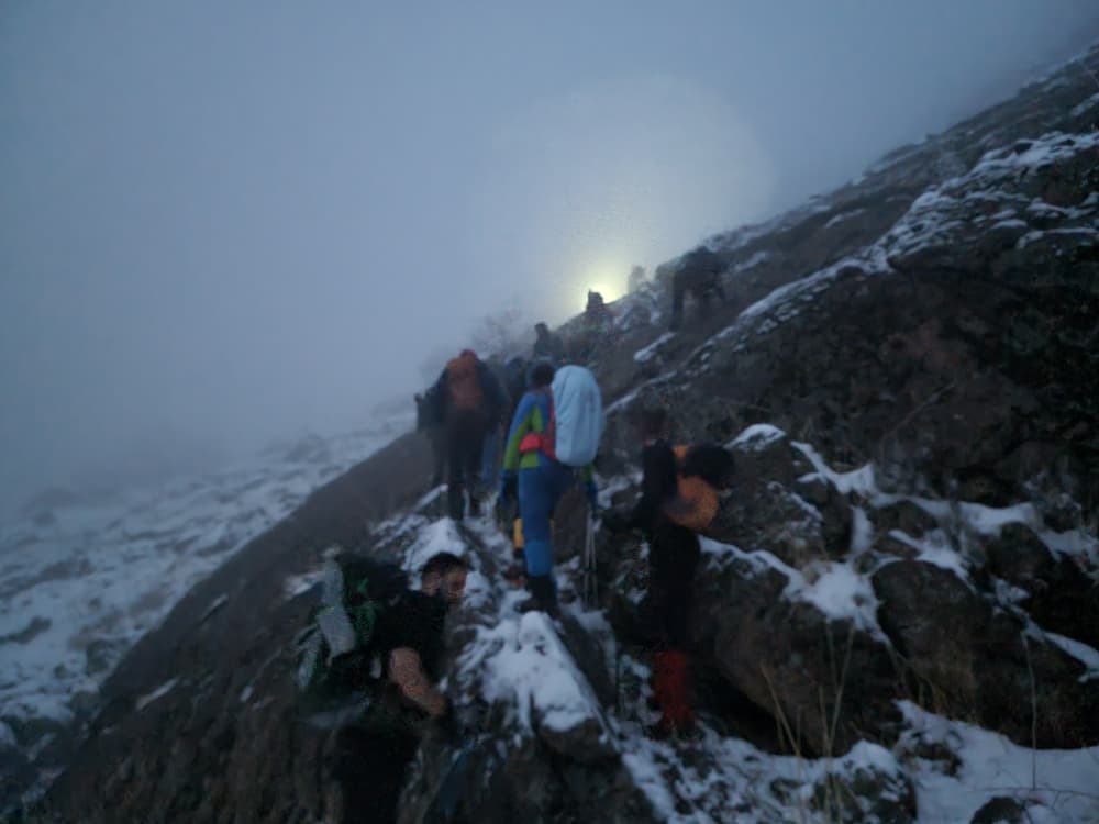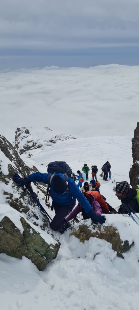 در نزدیکی قله، شرایط زمستانی چهره‌ی جدی‌تری به خود گرفت؛ باد آغاز شد، اما روحیه‌ی خوب همنوردان باعث شد تیم با انرژی و فضای مثبت تا قله پیش برود. ساعت ۱۲:۱۵، با رسیدن انتهای تیم، عکس یادگاری روی قله گرفته شد. در این بخش همچنین یکی از همنوردان قدیمی را به‌صورت اتفاقی ملاقات کردیم و عکسی به یاد گذشته ثبت شد.