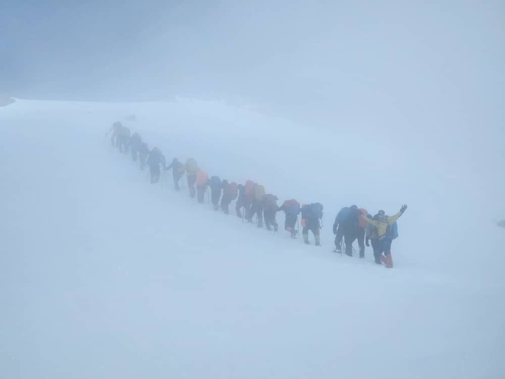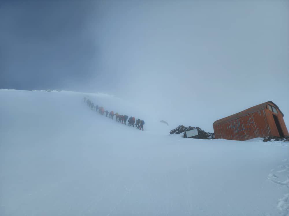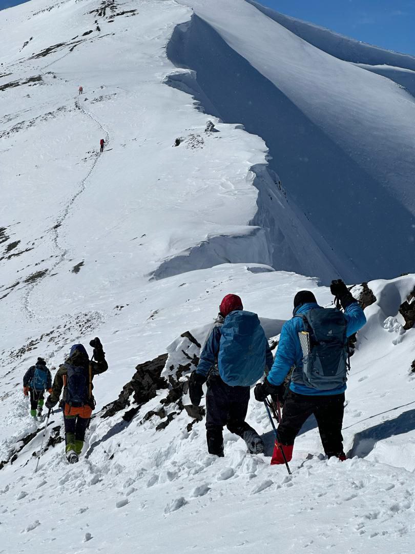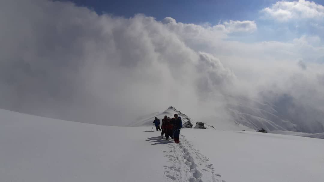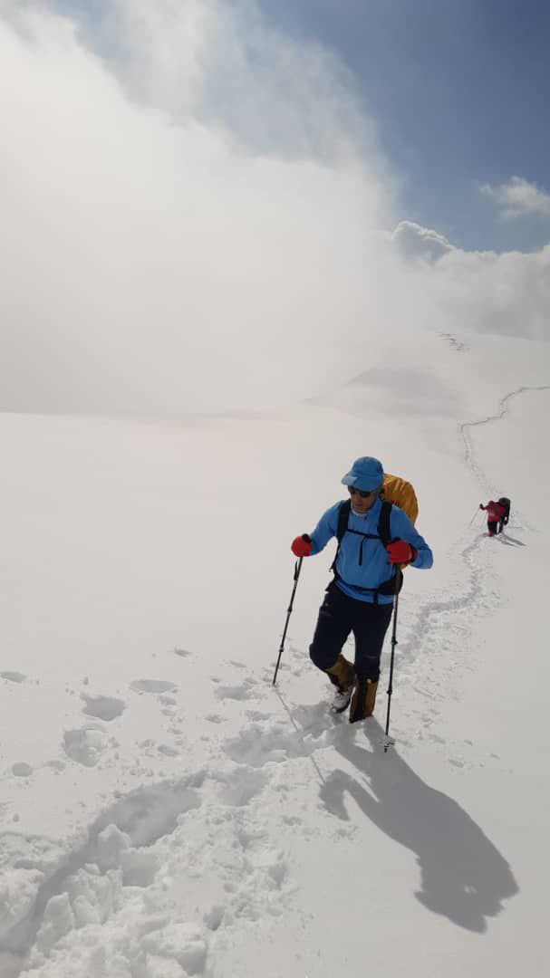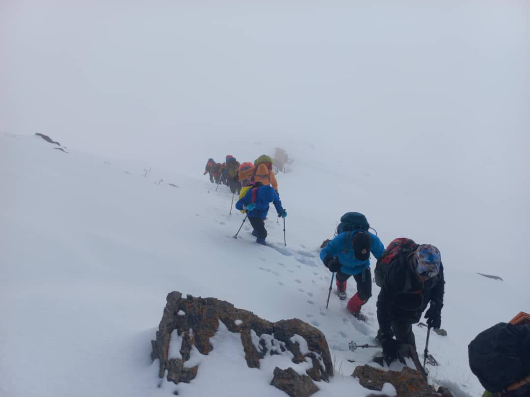 بعد از حدود ۲۰ دقیقه استراحت و صرف صبحانه ۱۶ نفر از اعضای گروه به سمت قله حرکت کردند ، از سمت راست پناهگاه به روی یال اصلی قله میشینه نو رفتیم و با توجه به بارش برف روزهای گذشته و حجم زیاد برف و احتمال ریزش بهمن و در نظر گرفتن فاصله مناسب از نقابهای برفی میبایست مسیرهای مطمئن تر و ایمن تری برای صعود انتخاب میکردیم . بعد از بارش برف روزهای گذشته هیچ گروه و یا شخصی از این مسیر صعود نکرده بود ، بر خلاف انتظار بر روی یال برف زیادی بود که با همت و همکاری کلیه نفرات تیم به نوبت برف کوبی انجام میشد . هوا هم کمی بهتر شده بود ، نیمه ابری و دیگر بارش نداشتیم .