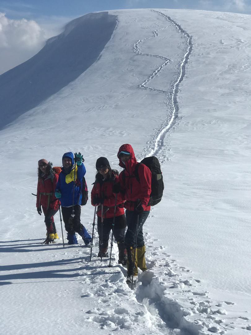 در ارتفاع ۳۸۰۰ تصمیم گرفته شد ۵ نفر از اعضای تیم که توانایی ادامه مسیر رو نداشتند در قالب یک تیم برگردند و ۱۱ نفر دیگر به صعود ادامه دادند ، ساعت ۱۳:۲۰ تیم پیشرو به قله میشینه نو به ارتفاع ۴۰۵۰ رسید و بعد از کمی استراحت به سمت قله ناز حرکت کرد ، ساعت ۱۴ تیم پیشرو به قله ناز رسید ، سرعت باد بر روی قله حدود ۳۰ کیلومتر در ساعت و دمای حسی حدود منفی ۱۰ درجه بود . به دلیل وجود باد مجبور به استفاده از چادر نجات شدیم تا منتظر دیگر اعضای صعود کننده بمانیم ، بعد از رسیدن همه ۱۱ نفر و گرفتن عکس یادگاری ساعت ۱۵ از همان مسیر رفت برگشتیم .