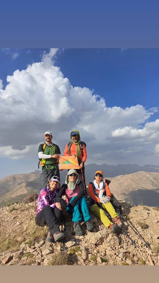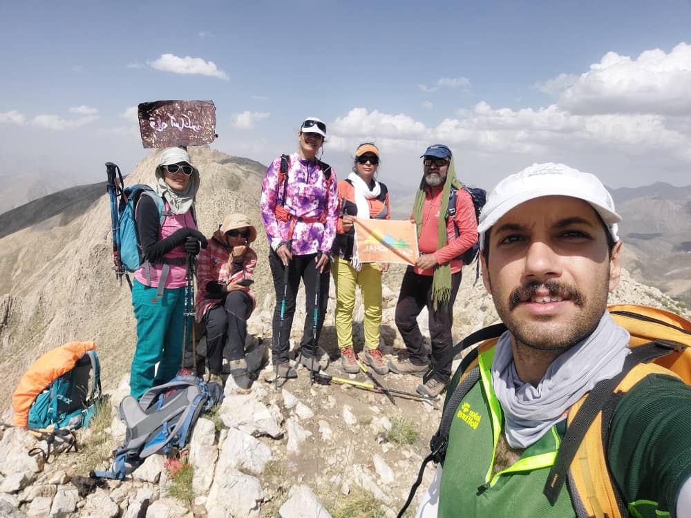 پس از ساعت ها چالش توامان پیمایش و دست به سنگ در ساعت ۱۳.۳۰ به اولین قله فرعی و در ساعت ۱۴ به دومین قله فرعی که تابلوایی هم داشت رسیدیم. پس از یک ساعت توقف بر روی این قله جهت ناهار با گرفتن عکس دستهجمعی به سمت قله اصلی حرکت کردیم و در حدود ساعت ۱۶ به قله اصلی رسیدیم.