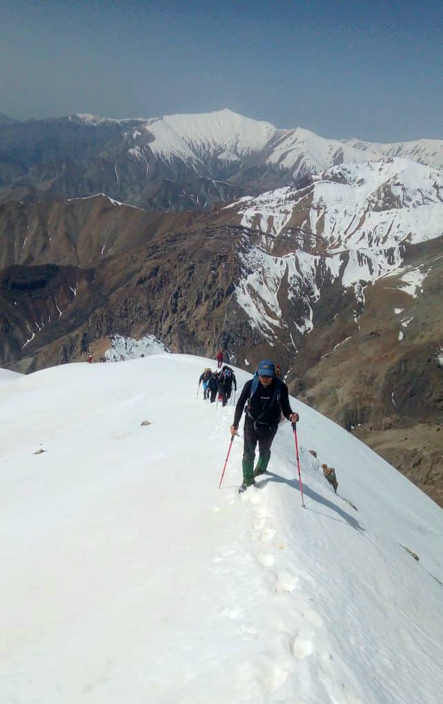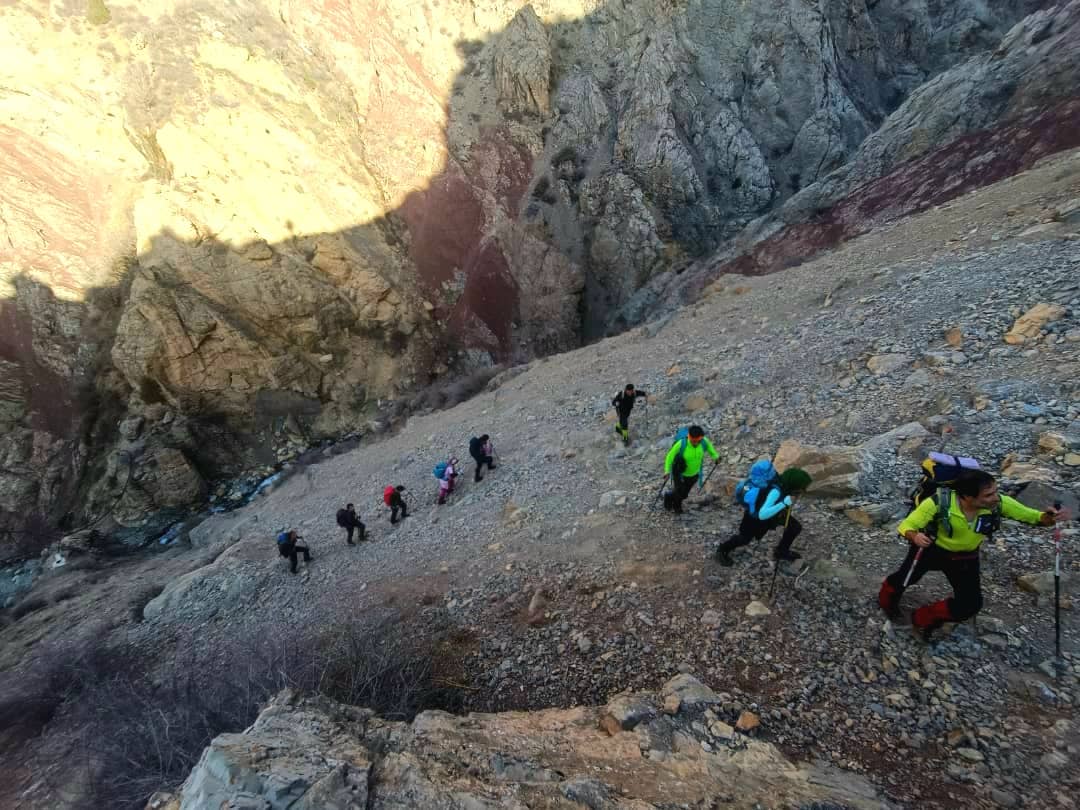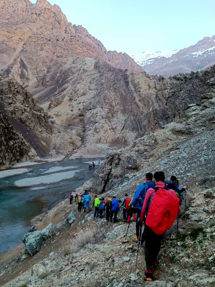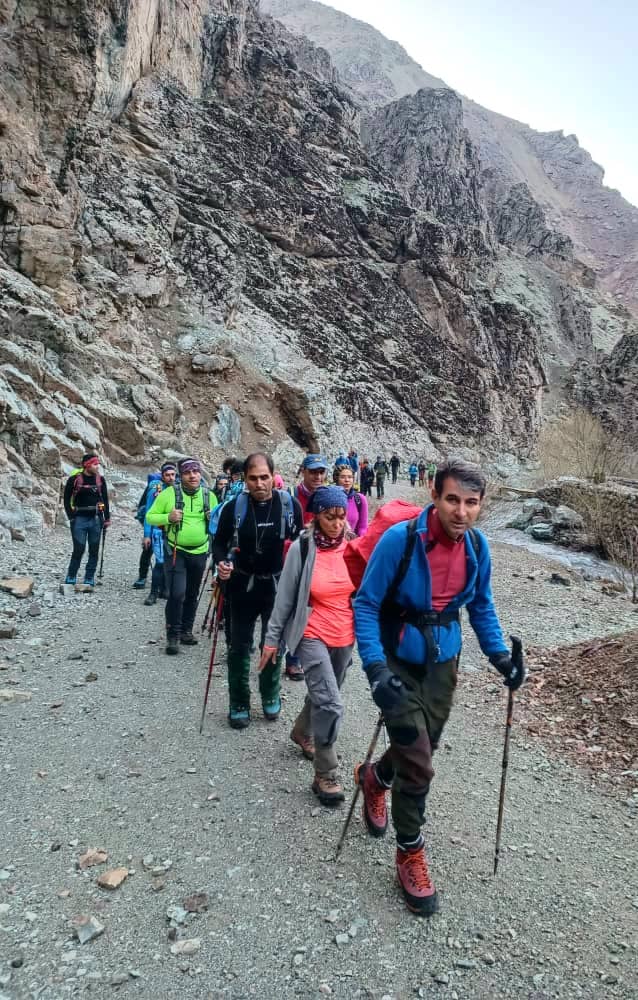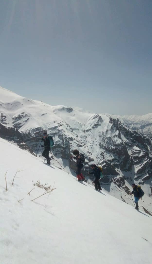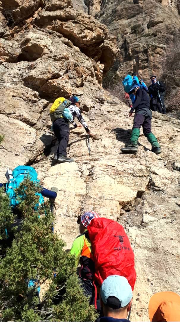 شیب تند بعد از رودخانه را بالا رفتیم و در ارتفاع ۲۳۵۰ در زیر دیواره های سنگی برای صرف صبحانه ایستادیم . بعد از صبحانه تعداد ۲۹ نفر از همنوردان برای صعود قله آماده شدند و تعداد ۹ نفر از همنوردان به سرپرستی آرمین فرازمان تصمیم به صعود تا ارتفاع ۳۰۰۰ و سپس فرود به روستا را گرفتند. در ساعت ۸:۳۰ صبح از محل صبحانه به سمت قله حرکت کردیم هوا بسیار مساعد و مناظر بسیار چشم نواز بود. در این نقطه از پاکوب اصلی که به سمت شرق و درون دره ادامه دارد جدا شدیم و به سمت شمال ادامه مسیر دادیم بعد از کمی پیمایش به دهلیز سنگی رسیدیم که برای صعود حتما باید دست به سنگ شوید این مسیر با سنگ چین های متعدد مشخص شده است .بعد از عبور از دهلیز اول بعد از نیم ساعت پیمایش به دهلیز سنگی دوم رسیدیم . بعداز صعود از دهلیز با چرخش به سمت شرق به ابتدای یال اصلی صعود قله کلاش ویا خواهید رسید این یال ابتدا به سمت شرق و سپس با کمی چرخش محسوس به سمت شمال ادامه پیدا میکند و به خط الراس کرچان هفت خانی منتهی میشود بعد از رسیدن به خط الراس باید به سمت غرب ادامه مسیر داد و در ارتفاع ۳۸۵۰ به قله کلاش ویا خواهید رسید. در روز صعود ما (۱۸فروردین ۱۴۰۲) بعد از دهلیز سنگی دوم و تقریبا از ابتدای یال منتهی به قله مسیر کاملا پر برف و کمی یخ زده بود و از ابتدای یال باد با سرعت حدودا ۲۰ کیلومتر شروع شد .از ارتفاع حدود ۳۵۰۰ سرعت باد به حدود ۴۰ کیلومتر و دمای حسی حدودا ۵ درجه زیر صفر رسید . تیم ما در ساعت ۱۲:۳۰ موفق به صعود قله شد و نیم ساعتی را بر روی قله به انتظار دیگر دوستان ایستادیم و بعد از گرفتن عکس قله فرود را آغاز کردیم . در برگشت وجود چاله برفی ها که با تابش نور خورشید ایجاد می شود کمی حرکت ما را کند کرد اما به یمن شیب زیاد در ساعت ۲:۴۵ به اول دهلیز سنگی رسیدیم و نهار را صرف کردیم. فرود از دهلیز اول و دوم وقت زیادی از ما گرفت (حدود ۲ ساعت)و سپس با رودخانه ایی پر آب مواجه شدیم همانطور که میدانید در این فصل در طول روز بدلیل آب شدن برف بر حجم آب رودخانه اضافه میشود ما نیز مجبور شدیم چند بار عرض رودخانه پر آب را عبور کنیم و در ساعت ۶:۳۰ به روستای سپهسالار برسیم . صعود قله کلاش ویا در این فصل با وجود رودخانه و سنگنوردی و برف و با وجود دیواره های سنگی و درختان کاج زیبا صعودی چالش برانگیز و دلچسب خواهد بود .