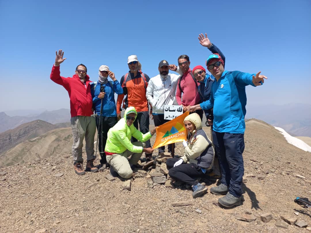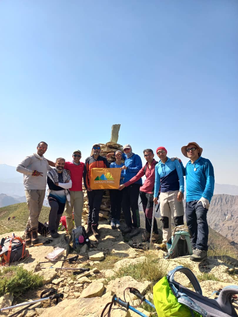 بهر حال حدودا ساعت ۹ صبح بود که به برج های معروف سنگی که در مسیر قله وجود داشت رسیدیم، ارتفاع این قسمت ۳۷۰۰ متر اعلام شد، تیم‌قوی و یکدست ما در حال صعود بود و با زمان عالی که داشتیم از زمانبدی برنامه خودمون جلوتر بودیم، در ادامه به تیم جلویی رسیدیم و خوش و بشی با دوستان کردیم و راهی شیب نفسگیر یال زیر قله شدیم‌، این قسمت رو هم به خوبی گذر کردیم و به بالای این یال رسیدیم، از اینجا تابلو قله مشخص بود و حدودا نیم ساعتی تا قله راه بود، به دوستان گفتم مسیر را ادامه بدهند و خودم با نفرات آخر به قله رسیدم، ساعت ۱۰:۱۵ دقیقه همه نفرات تیم به قله رسیدند. همگی تلاش و همت بسیاری به خرج دادند تا این قله صعود شود، تابلو قله ارتفاع ۴۰۰۳ متری را نشان میداد، منظره بسیار زیبایی از قلل تخت سلیمان از قله زرینه کوه دلیر تا هفت خوان های علم کوه رو شاهد بودیم، عکس های یادگاری را با قله گرفتیم و فرود را آغاز کردیم، راه طولانی در پیش داشتیم و دوباره باید در بعضی قسمت ها صعود میکردیم، در فرودمان از تراورس ها استفاده کردیم و مجبور شدیم کمی مسیرمان را تغییر بدهیم، در اواسط راه کوهنوردی را دیدیم که از ما درخواست کمک میکند و گفت بی آب مانده و مسیر را گم کرده است، وی را همراه خودمان تا چشمه ترازان آوردیم و تحویل دوستانش دادیم (قابل توجه سرپرستان تیم !!!)