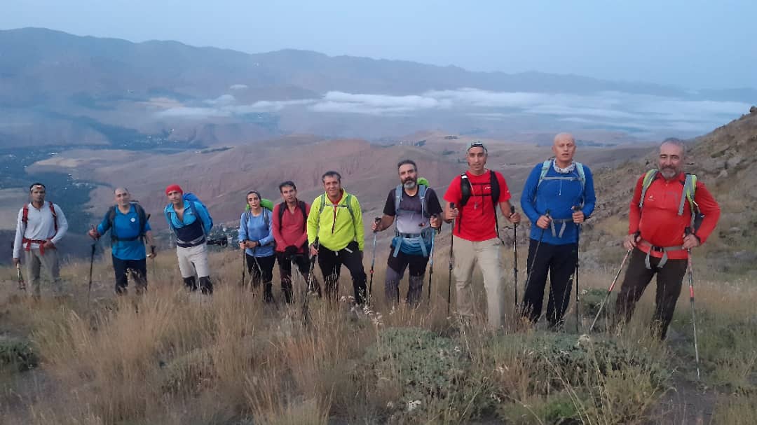 شرح برنامه: شروع برنامه ما از روز پنج شنبه مورخ ۱۴۰۳/۵/۴ از تهران بود که بوسیله سه دستگاه وسیله نقلیه به همراه ده نفر از همنوردان سرکچالی ساعت حدودا ۲ ظهر به سمت روستای کرکبود طالقان به راه افتادیم و تصمیم گرفتیم شب را در این منطقه بگذرانیم و فردا صبح بسیار زود صعودمان رو شروع کنیم، حدودا ۳ ساعت این مسیر ۱۵۰ کیلومتری زمان برد، راه دسترسی به روستای کرکبود ابتدا از شهر جدید هشتگرد، روستای فشند، جاده جدیدهشتگرد_طالقان و در ادامه شهرک طالقان و در انتها روستای کرکبود میباشد. کرکبود روستایی مرتفع و کوهستانی با مردمانی خونگرم و مهمان نواز است. در ادامه منزلی را در این روستا اجاره کردیم و فردا صبح ساعت ۳ صبح استارت زدیم، در تاریکی مطلق از کوچه باغ ها و در ادامه از آبشار معروف کرکبود گذشتیم، پیدا کردن پاکوب کنار آبشار کمی گیج کننده بود(باید از کف رودخانه عبور کرد و یک گرده سنگی رو هم زمان هم صعود کرد هم دور زد) بهر حال این مرحله را پشت سر گذاشتیم و از طریق نیمچه پاکوب و از روی سنگچین ها به صعودمان ادامه دادیم، هر چند که ترک مسیر را از قبل تهیه کرده بودم ولی به شخصه مسیر سنگچین شده را ترجیح میدادم. یال های پرشیب را صعود میکردیم و در ادامه به دو کله قندی رسیدیم به نام قلل دو میل و در ادامه به یک گوسفند سرا و آثاری از یک آتشکده قدیمی که امروزه به نام امام زاده حنیفه معروف است.