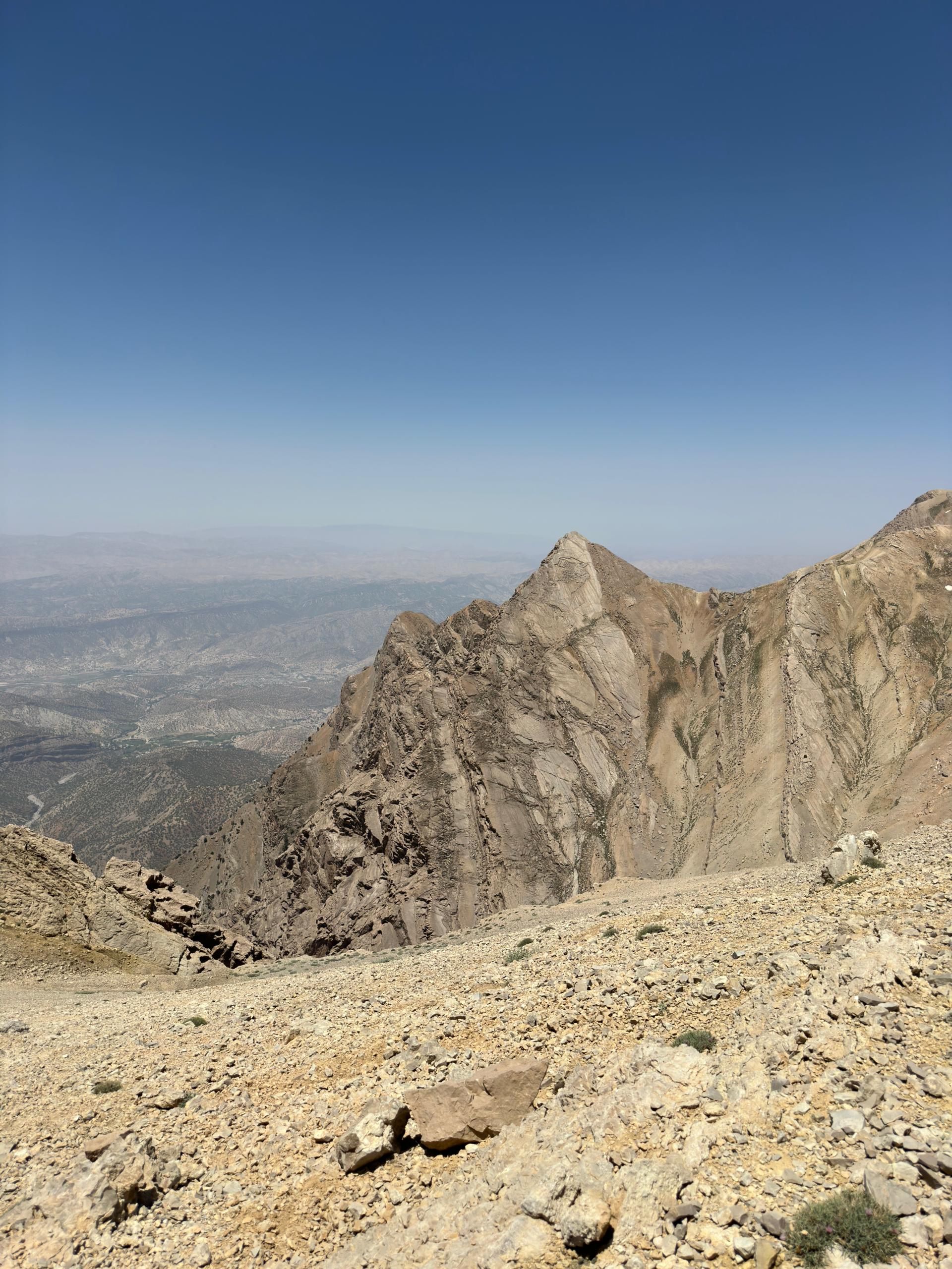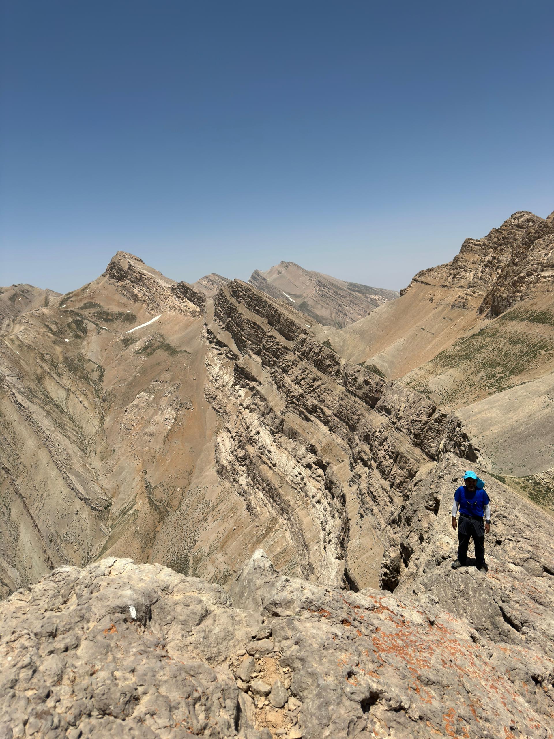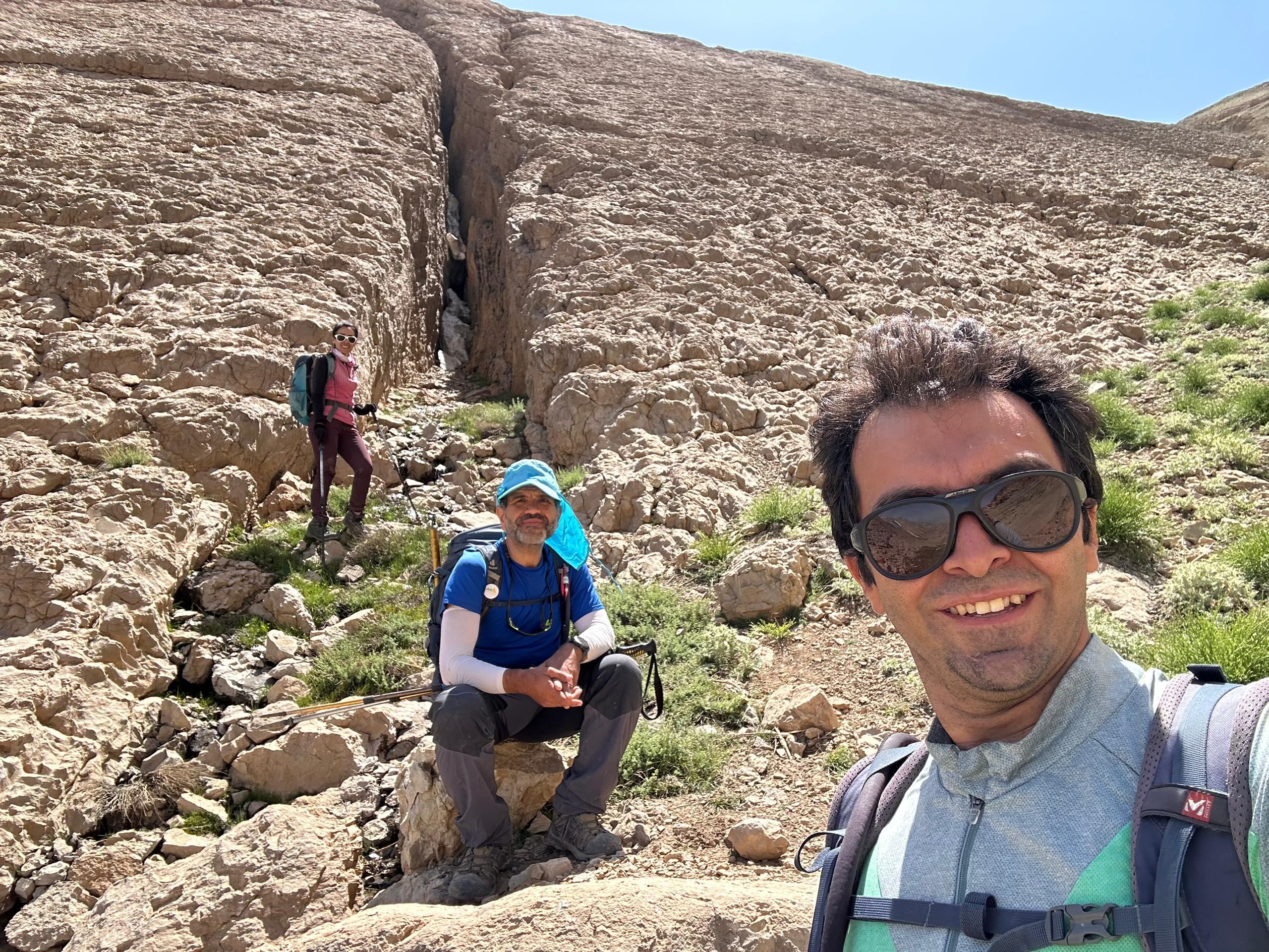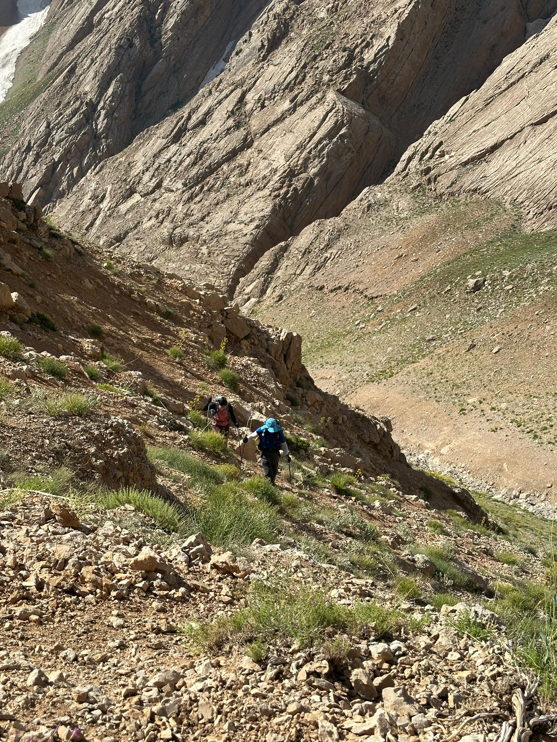 بعد از گرفتن عکس های یادگاری بر فراز قله به سمت گردنه بازگشتیم و در نهایت ساعت ۱۳:۱۵ از گردنه به سمت کف دره فرودمان را آغاز کردیم. با توجه به نبود پاکوب مشخص و شکاف هایی در دل سنگ که از انها آب جاری بود و رودخانه کف دره ، فرود با مشکل و احتیاط بیشتری انجام شد.
