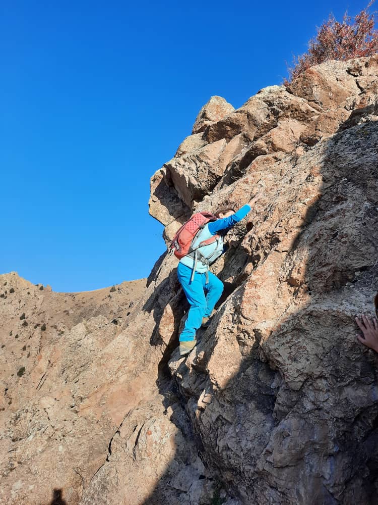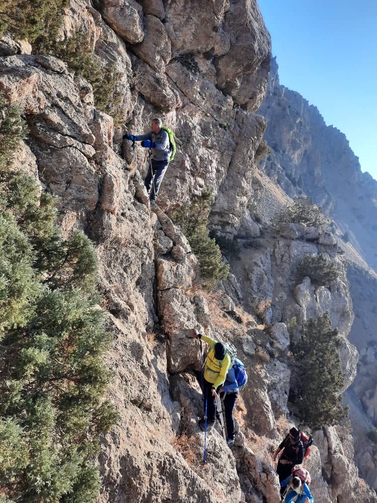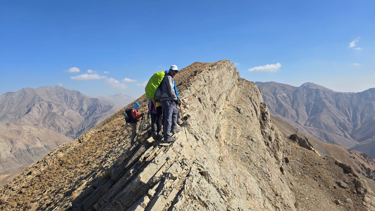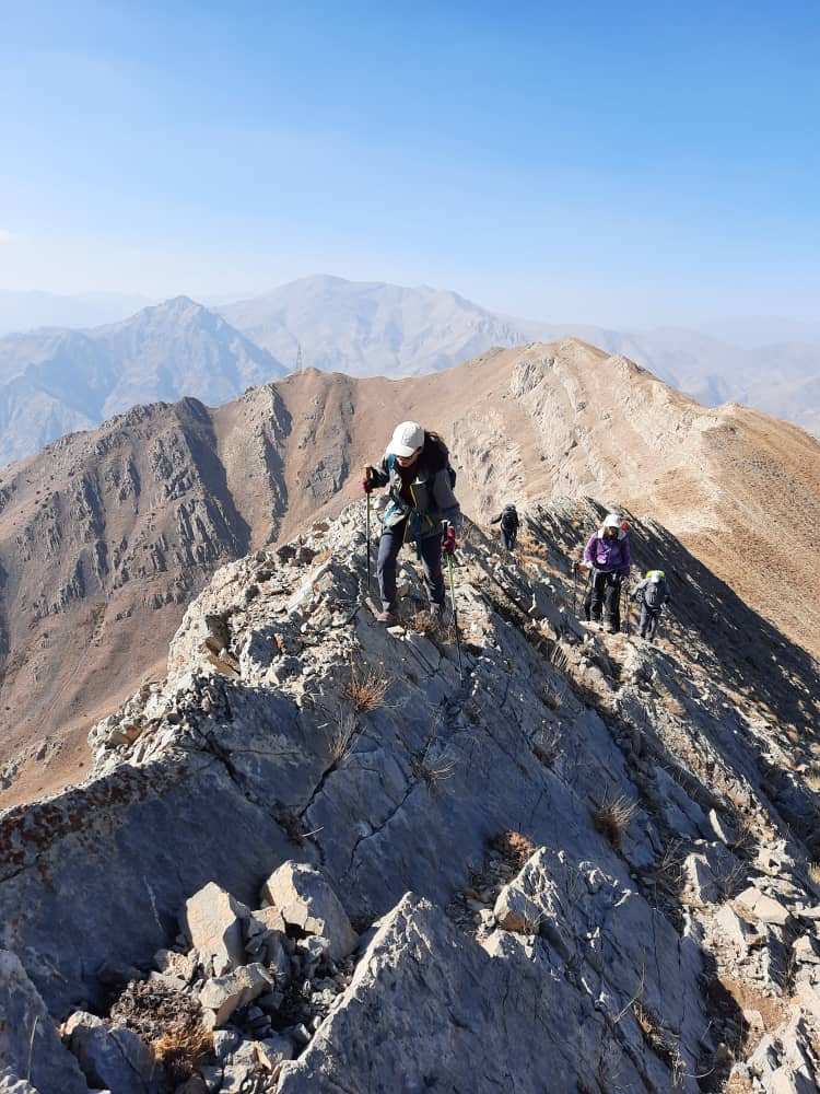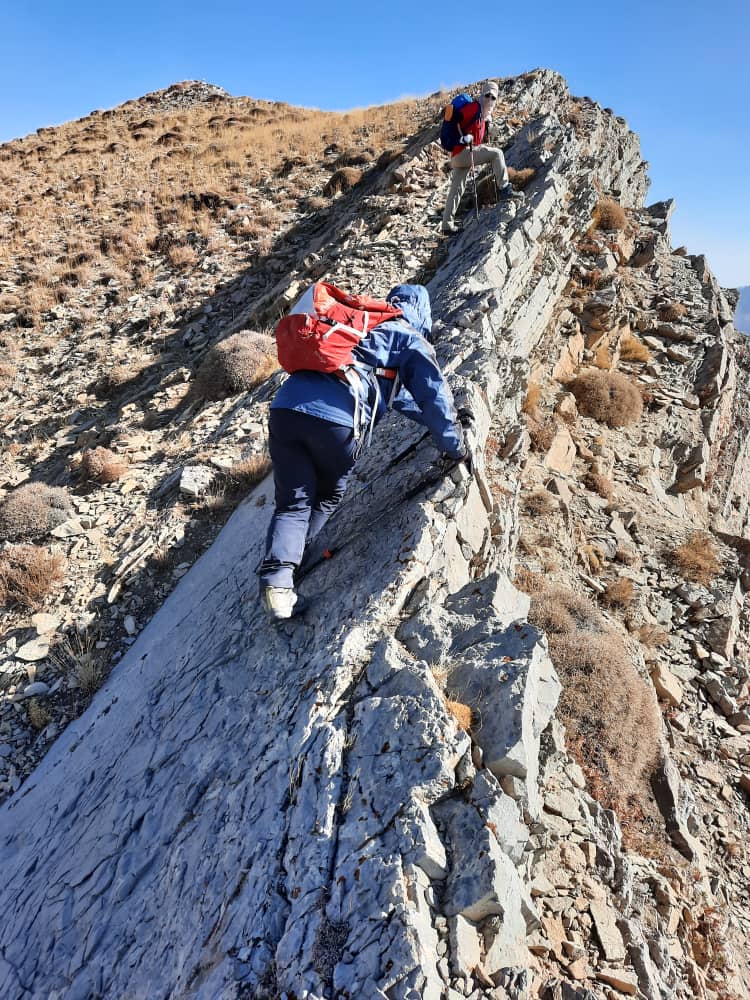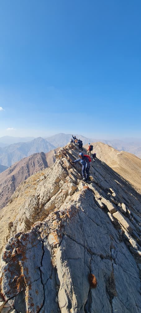 بعد از کمی استراحت ساعت ۱:۳۸دقیقه به سمت قله بعدی حرکت کردیم بین این دو قله هم قسمت هایی از خط الراس تیغه ای هست که با احتیاط نفرات از تیغه ها عبور کردند.