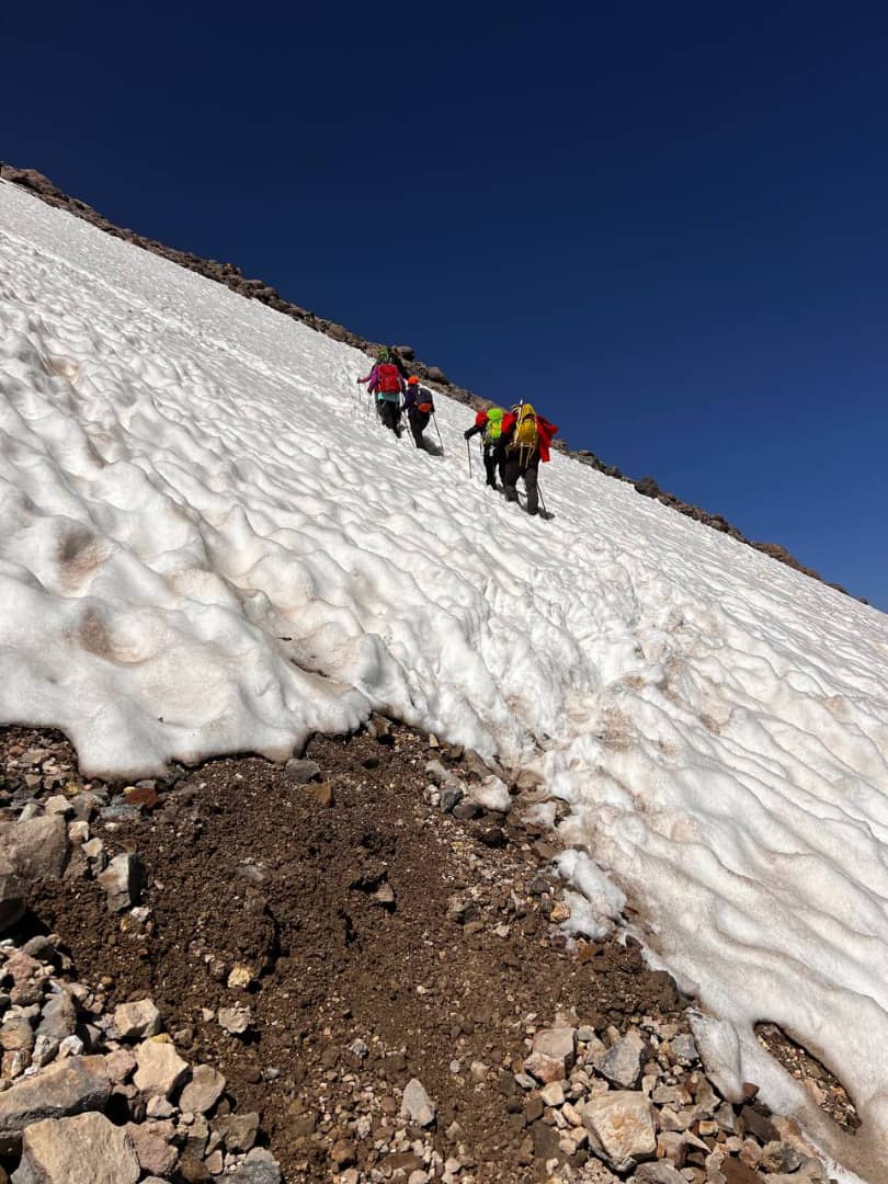 مشاهده دره یخار و دیواره گوگردی قله ، و ادامه پیمایش و گرفتن ارتفاع ، از ارتفاع پنج هزار سرعت صعود را کمتر کردیم ، تا به محلی رسیدیم که باید مسیر برفی را تراورس می کردیم .