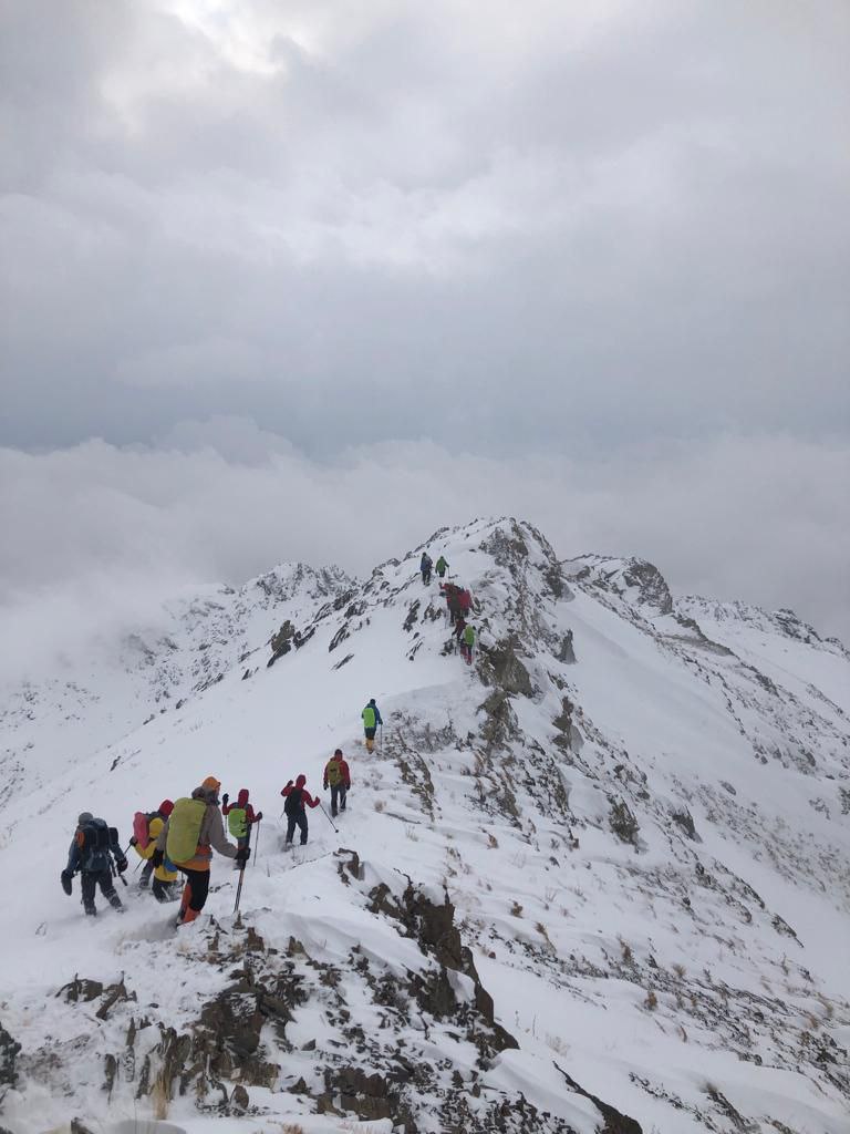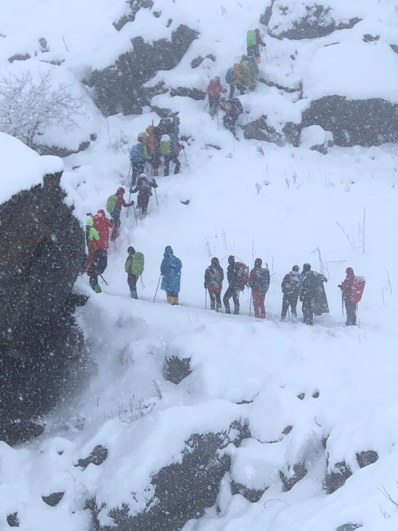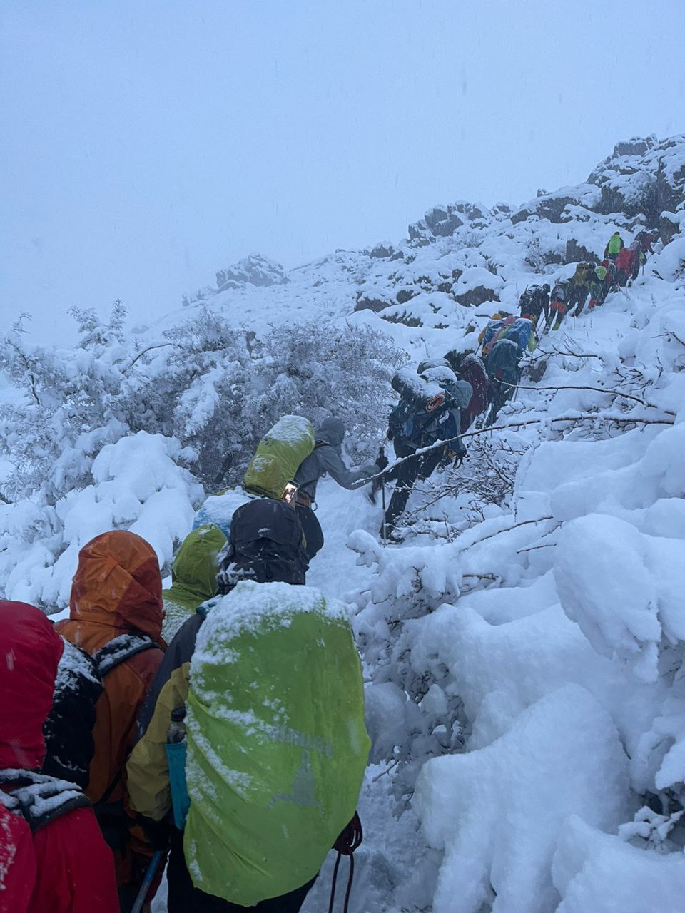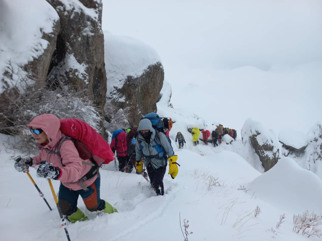 با توجه به وضعیت جوی و هشدار های هواشناسی در خصوص اجرای برنامه کوهنوردی با شگاه سرکچال تصمیماتی مبنی بر این اینکه احتمال بارش روز پنجشنبه و نیز اختلال در تردد جاده ای وجود داشته باشد ،قرار بر این شد برنامه در محدوده شهر تهران برگزار گردد. برنامه صعود به کلکچال و توچال از مسیر گرده ای شرقی پارک جمشیدیه توسط اعضای هیات مدیره باشگاه پیشنهاد و مصوب گردید . برنامه ریزی این صعود با حساسیت شرایط جوی ناپایدار و هشدار های هواشناسی اعلام شده در چند روز اخیر انجام شد . پس از ثبت نام اعضا و مشخص شدن اعضای گروه جهت این برنامه توصیه های لازم در خصوص همراه داشتن تجهیزات کامل زمستانی و نیز آمادگی جسمانی اعضاء اعلام شد . قرار بر این شد که این صعود آموزشی باشد و همزان با صعود نحوه گام برداری در برف ، بهمن شناسی ، معرفی تجهیزات زمستانی و عبور از تیغه ها در شرایط زمستانی و نیز صعود و فرود با طناب و توسط مربیان باشگاه سرکچال آموزش داده شود و باز آموزشی باشد برای اعضای شرکت کننده این برنامه در راستای ارتقای دانش و مهارت های کوهپیمایی و کوهنوردی با توجه به حوادث و اتفاقات در ورزش کوهنوردی . محل قرار انتهای پارک جمشیدیه و ساعت 5:30 بود . شب قبل از برنامه وضعیت بارش و برف بررسی و اعضا نظراتی ارائه دادند . هوا ناپایدار و برفی بود ساعت قرار در محل حاضر شدیم و برف همچنان در حال باریدن بود همه خوشحال بودن از این بارش پس از گذشت تقریبا 3 ماه کم بارش .با توجه به لغزنده بودن معابر تعدادی از همنوردان دیر رسیدند .ساعت 6:10 پیمایش صبح روز جمعه 22/10/1402 با حضور 30 نفر از اعضای باشگاه سرکچال در هوایی برفی و دل انگیز آغاز شد، انتهای پارک جمشیدیه به سمت یال گرده ای شرقی کلچال مسیر را ادامه دادیم مسیر پوشیده از برف بود ابتدای مسیر حدوداً 15 سانت برف بر زمین نشسته بود پس از یک ربع پیمایش یک نفر از از اعضا تصمیم به برگشت گرفت که با هماهنگی و موافقت سرپرست برنامه برگشت . هر چه زمان می گذشت بارش شدیدتر و برف بیشتر بر زمین می نشست هوا خوب بود سرعت باد پایین بود .پس از یک ساعت از پیمایش و با روشن شدن هوا ساعت 7:20 بخشی از آموزش که نحوه گام برداری در برف بود توسط آقای محمد رضابهروزی از مربیان با اخلاق و توانمند باشگاه ارائه گردید . پس از یک ربع گروه به مسیر ادامه دادند . مسیر کاملا صخره ای بود قسمت های از مسیر را هم به منظور آموزش کار با طناب و هم به منظور ایمنی بیشتر با استفاده از طناب و مهارت های استفاده از گره و طناب پیمایش شد . پس از 2 ساعت ونیم پیمایش مسیر 2 نفر از اعضا در نزدیکی اردوگاه تصمیم گرفتند مسیر ا ادمه ندهند و برگردند . با موافقت سرپرستان برنامه و همراهی و راهنمایی مربی به سمت اردوگاه که در قسمت جنوبی مسیر بود هدایت شدند . پس از نیم ساعت ادامه مسیر در ساعت 9 صبح در محلی مناسب و کنار صخره ای بزرگ صبحانه به مدت یک ربع صرف شد . پس از صرف صبحانه ساعت 9:30 گروه توانمند و 26 نفره با اراده قوی و آمادگی کامل مسیر را با هدف صعود قله کلکچال ادامه دادند بارش گاهی موقتاً قطع می شد. هر چه بالا تر می رفتیم حجم برف و سرعت باد بالاتر و اراده گروه بیشتر می شد . گرده های مسیر پس از فراز و نشیب ها طی می شد گاهی بدلیل حجم زیاد برف تا 80 سانت و بیشتر از صخره می بایست عبور کرد. و نیاز به حمایت و استفاده از طناب بود و باز هم فرصتی بود برای دانش افزایی و مهارت آموزی در شرایط سخت که امروزه برای هر کوهنوردی لازم و ضروری می باشد . ساعت 12:30 پس از استراحت کوتاه مسیر را ادمه دادیم سرعت باد بیشتر شد و دمای هوا بسیار پایین بود اعضای تیم همچنان با قدرت مسیر را ادامه دادند. ارتفاع 3100 متر بود و با حساسیت بیشر و رعایت نکات ایمنی اعضای گروه به نوبت برف کوبی می کردند صحنه ای زیبا بود تلاش دوستان در این برنامه با همدلی و روحیه و مشارکت بالا 200 متر مانده به قله حجم برف در بعضی از قسمت ها از 100 سانت هم بیشتر بود و نقاب ایجاد شده بود در این قسمت نکات آموزشی در خصوص بهمن و نحوه عبور از مسیر های ایمن در برف ارا