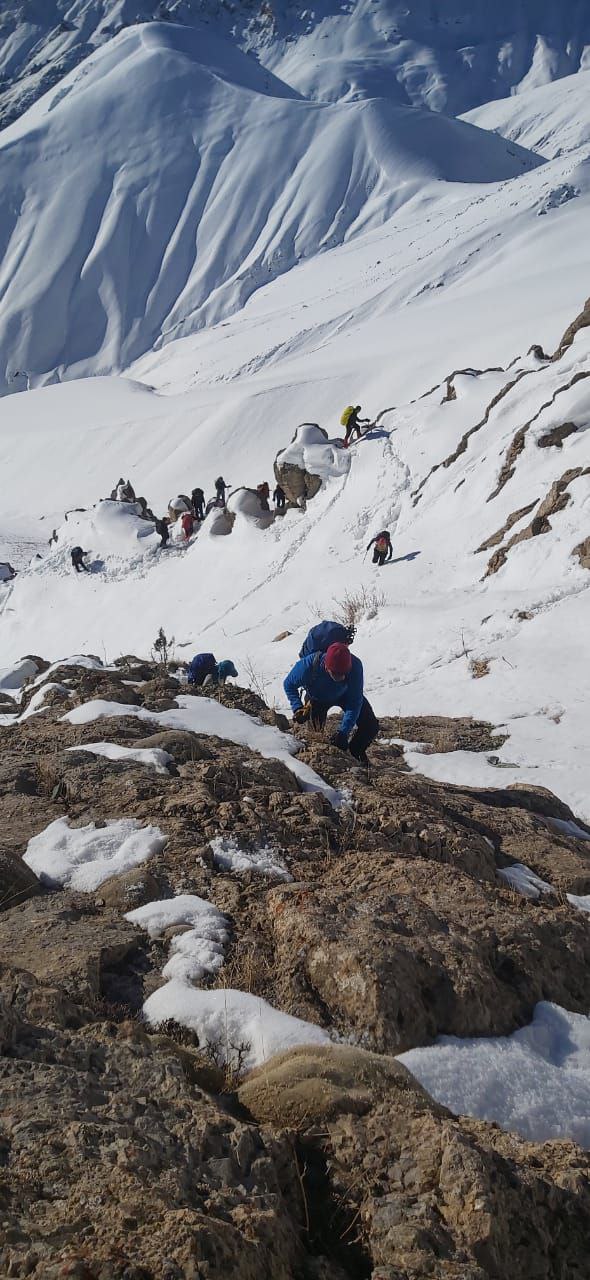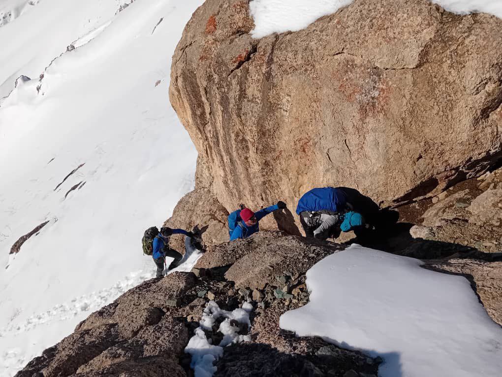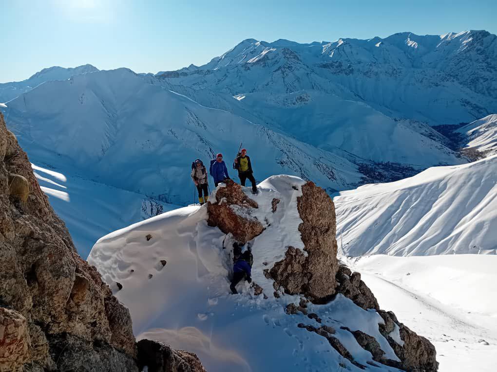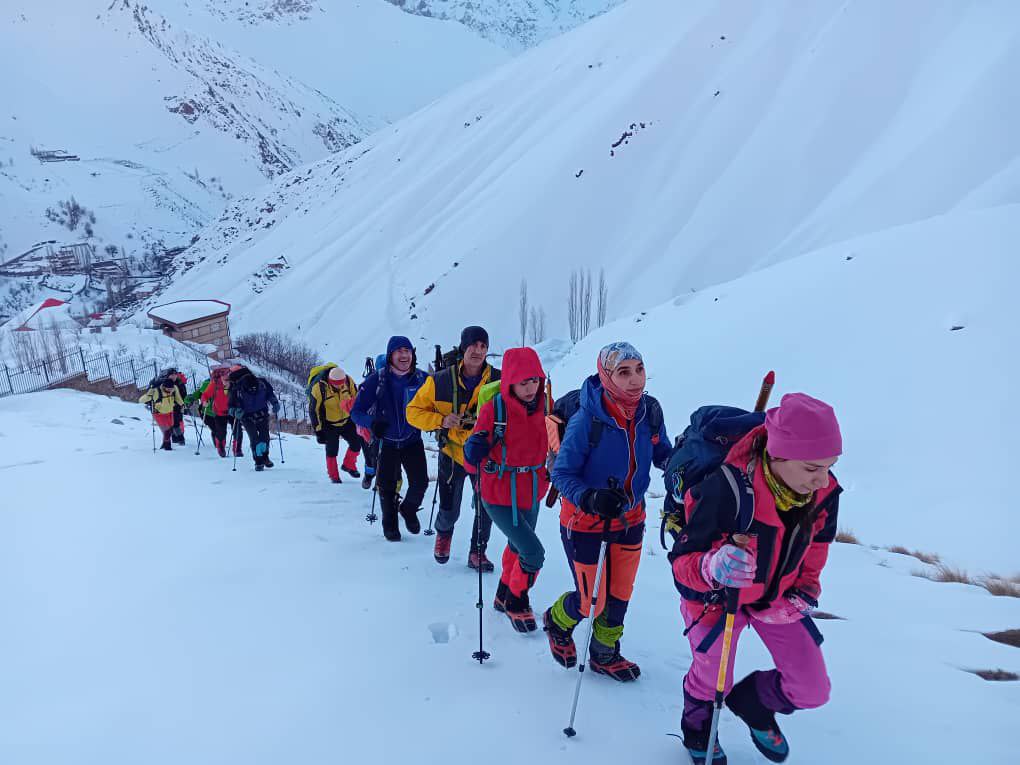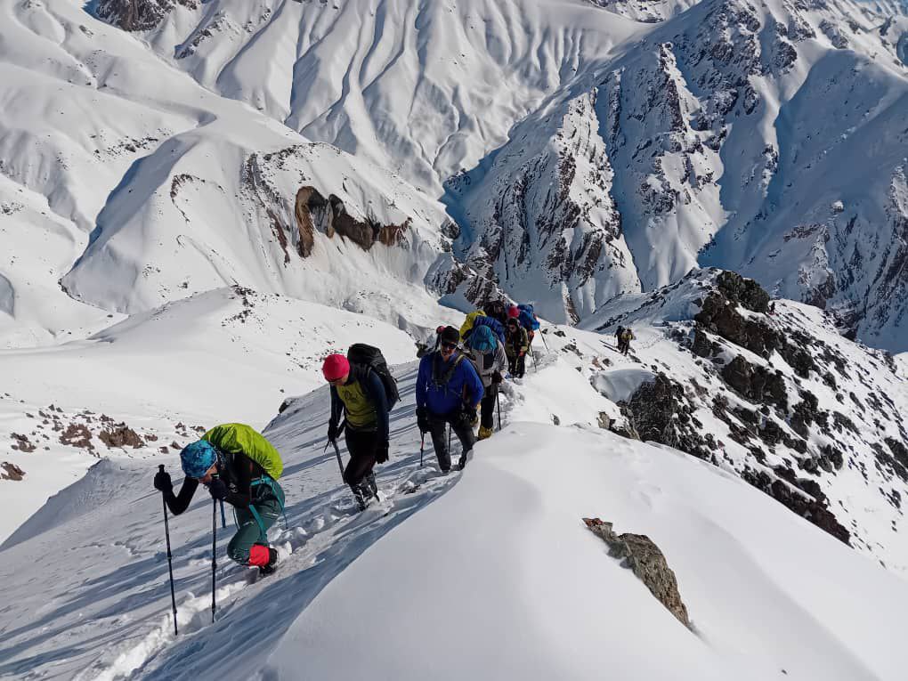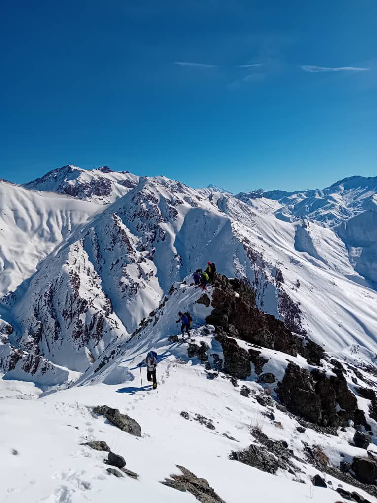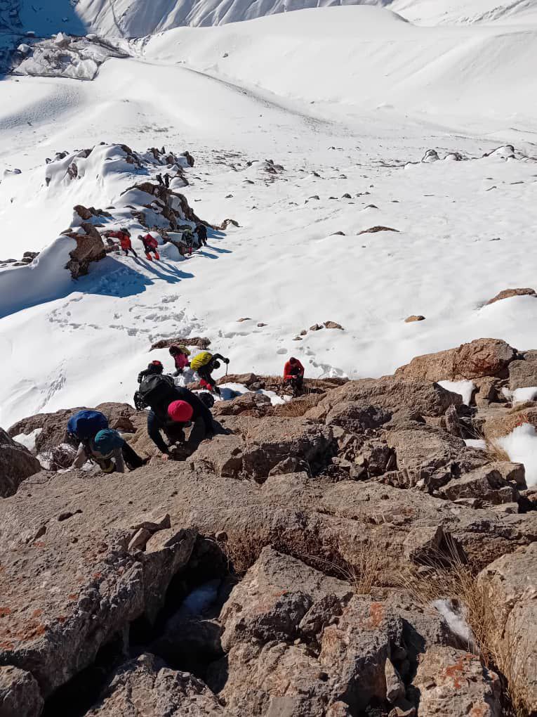 پس از رسیدن به میدان روستا مسیر سمت راست از کنار پل آهنی را ادامه دادیم که حدود 500 متر جلوتر با جاده یخ زده و پر برف مواجه شده وپس از کمی چالش مجبور شدیم به میدان برگردیم. ساعت 6.20 دقیقه حرکت آغاز شد. بعد از پیمایش جاده یخی به دوراهی رسیدیم و به سمت چپ(غرب) ادامه مسیر دادیم. مسیر پر برف بود و یخ زده. انتهای خیابان وبعد از اخرین خانه یال سمت راست (جنوب به شمال)را انتخاب کردیم ، شیب مسیر خیلی تند بود . آسمان صاف آبی رنگ و زیبا ودمای هوا که با تابش آفتاب کم کم به گرما گراییده همه و همه نوید یک صعود خوب را میداد. آقای بهروزی (مربی تیم) نکته های آموزشی خوبی را در مسیر و متناسب با شرایط مطرح میکرد . دراین یال در برخی جاها با دست به سنگهای متعددی روبرو شدیم که به صعودمان تنوع خوبی میبخشید و مجبور بودیم با احتیاط بیشتری و دست به سنگ صعود را ادامه دهیم . ساعت 9.30 جهت صرف صبحانه توقف کردیم . پس از نیم ساعت استراحت صعود از یال اصلی (شرق به غرب)ادامه پیدا کرد. در ارتفاع ۳۴۰۰ تصمیم برآن شد که ۷ نفر از دوستان که توانایی کمتری داشتند و تجهیزات کامل و متناسب برای ادامه مسیر نداشتند برگردند . در قسمتهایی عمق برف زیاد بود ( ۶۰ سانتی متر ) و میبایست برف کوبی میکردیم و در قسمتهای که برف کم بود بصورت لایه یخی روی سنگها بود که باعث میشد سرعت کم شود ، ساعت ۲:۲۰ به اولین قله فرعی رسیدیم (۳۷۰۰) . تا قبل از قله فرعی هوا ارام و بدون باد بود ولی روی قله فرعی باد شدیدی(حدود ۴۰ تا ۵۰ کیلومتر) میوزید. تیم بدون توقف به سمت تیغه ها حرکت کرد و با احتیاط مسیر را ادامه میداد. شدت باد و برودت هوا عبور از تیغه ها را با کمی چالش روبرو کرد و حرکت با احتیاط را از سوی تیم میطلبید.در نهایت ساعت ۱۵ به قله شانه شرقی به ارتفاع حدود ۴۱۰۰رسیدیم .به دلیل سرعت زیاد باد سریع عکس قله را گرفتیم و از یال جنوبی فرود اومدیم و ارتفاع کم کردیم .