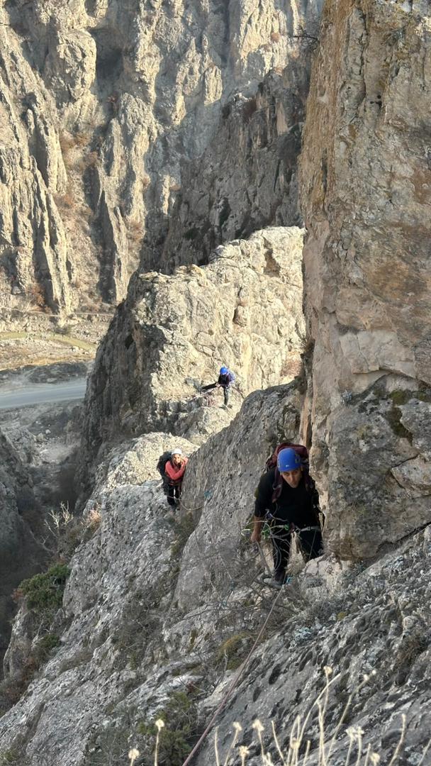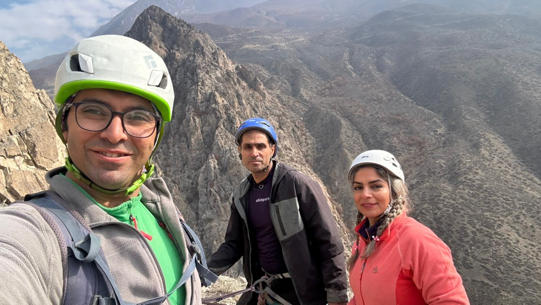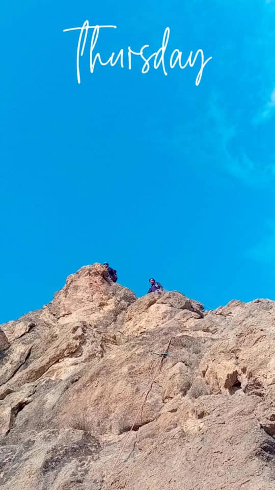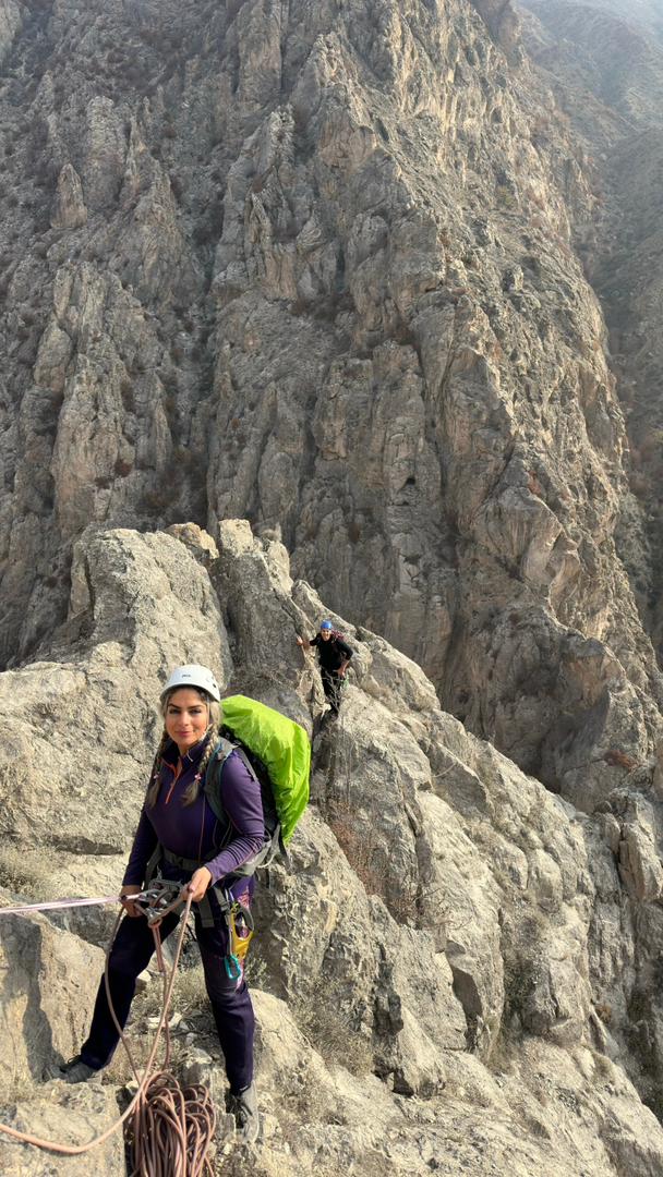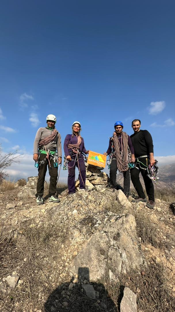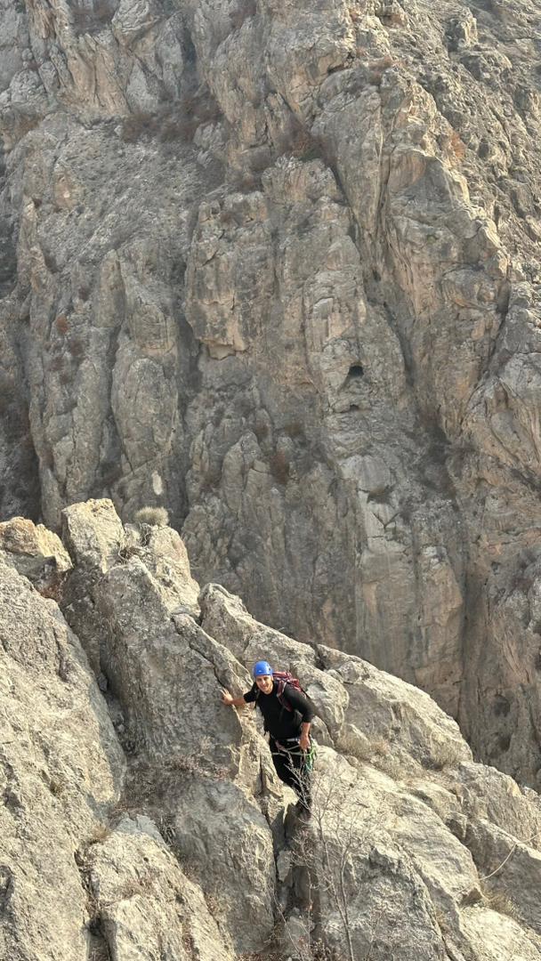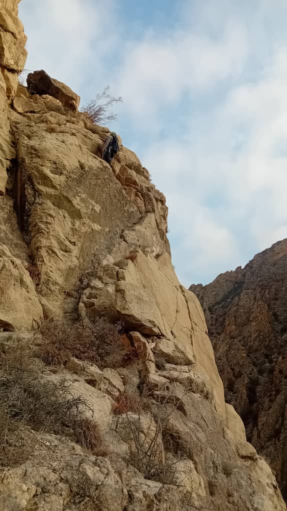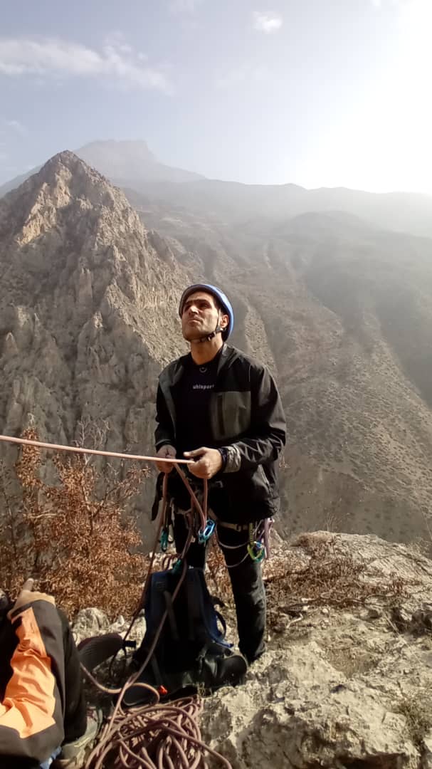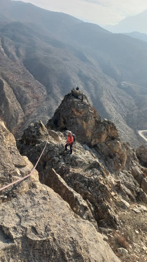 بعد از اقامت در سوئیت اجاره ای در محله چاپارخانه ابتدای جاده ارفعده صبح روز پنجشنبه ۶ آذر ۱۴۰۴ به سمت سایت سنگنوردی امافت حرکت کردیم ( کمتر از بیست دقیقه به سایت رسیدیم ) بعد از پارک ماشین و گرم کردن و پیدا کردن ابتدای مسیر حدود ساعت ۷ شروع به صعود کردیم . حدود دو هفته پیش که برای صعود سلاطین ۱ آمده بودیم بررسی میدانی از گرده سلاطین ۲ هم کرده بودیم . ( گرده سلاطین ۲ در کنار معدن دانه شن اوریم و روبروی سایت سنگنوردی امامف قرار دارد ) . برای استارت مسیر میبایست از کنار در معدن به ، ( سمت دیواره ) روی صخره ها رفت و به سمت جاده تا ابتدای گرده تراورس کرد ، درخت کوچک و فلشی که بسیار کم رنگ شده بود مشخصه های بودند که توانستیم رول های ابتدای مسیر رو پیدا کنیم و ما هم سنگ چینی درست کردیم تا از دور بهتر بشود ابتدای مسیر رو پیدا کرد . طول مسیر اول حدود ۵۰ متر با ۶ یا ۷ میانی ( رول ) و دارای کارگاه دونقطه ( رول و شیگل ) بود . وجود رول ها مشخصه خوبی برای فهمیدن مسیر درست است ، در برخی جاها به دلیل فاصله زیاد رول ها و برای بالا بردن ضریب ایمنی و بعضا ایجاد شکست طناب بابت عدم سایش روی سنگ ها با استفاده از فرند و یا تسمه دور سنگها میانی هایی هم میگرفتیم. کل تیم در دو کرده دو نفره مستقل ، یک کرده محمد مکی و راحله محمدی و یک کرده سعید هاشمی و مجید الهی بصورت ضربدری صعود میکرد .